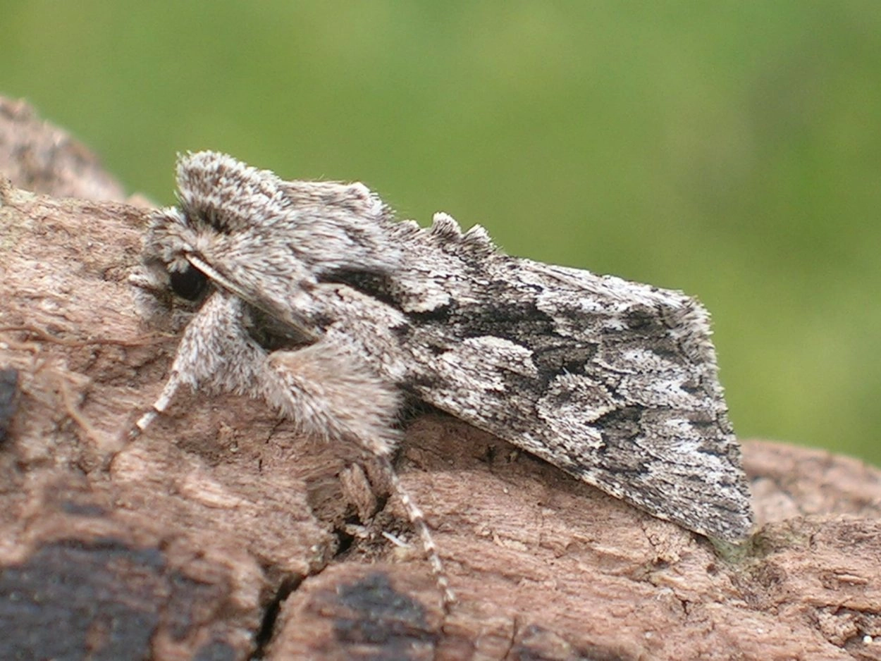 Voorvleugellengte: 15-18 mm. De zwartachtig grijze voorvleugel heeft een uitgebreide asgrijze marmering en een ruw korrelig uiterlijk. Karakteristiek is de tekening in het middenveld die bestaat uit een lichte ringvlek en een gedeeltelijk daarmee versmolten ’tweede ringvlek’; deze laatste is vaak weer verbonden met de lichte niervlek. Sommige exemplaren zijn tamelijk donker van kleur. Andere hebben een rozeachtige gloed, vooral in de franje, maar soms ook op de rest van de voorvleugel.