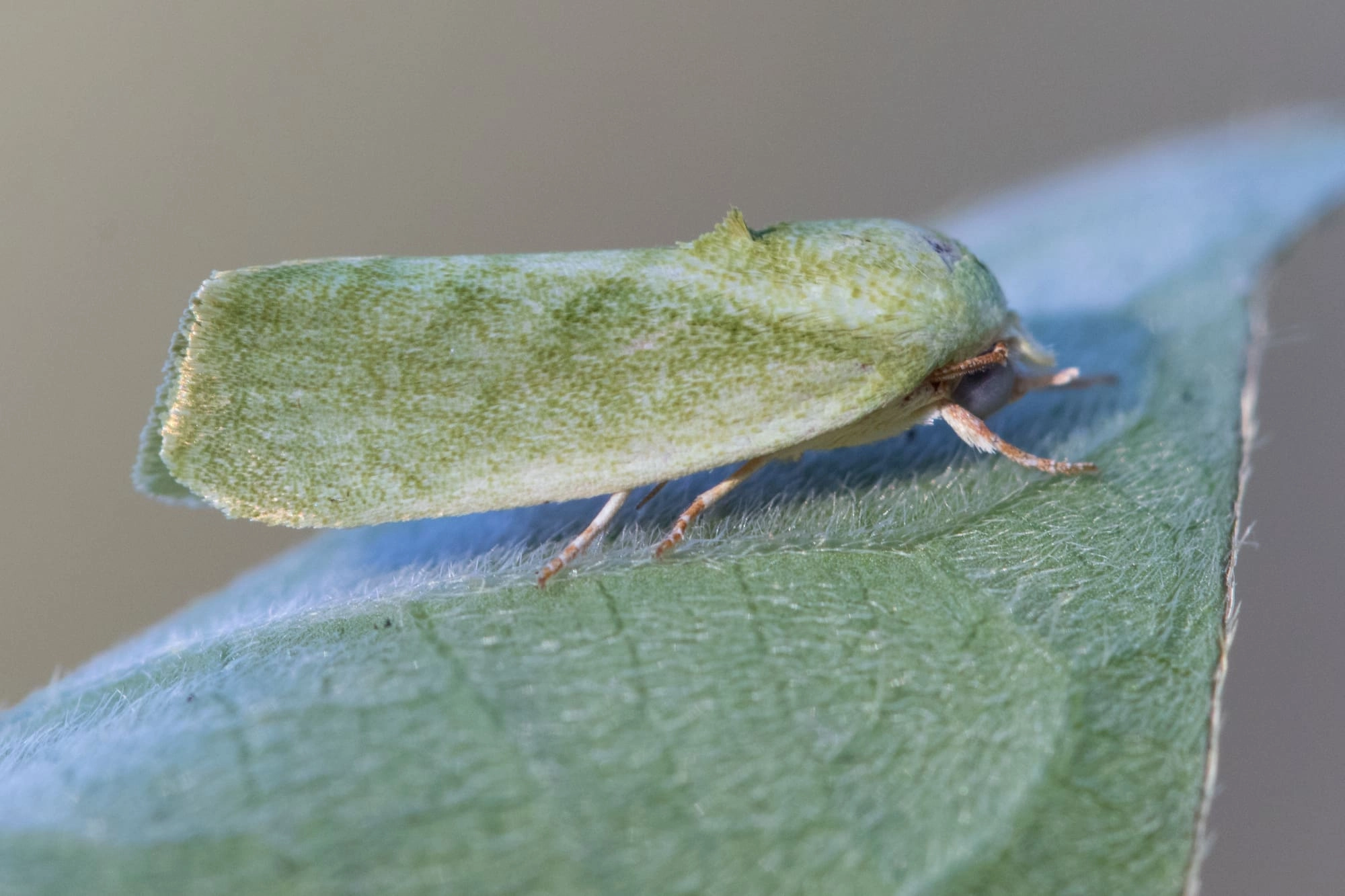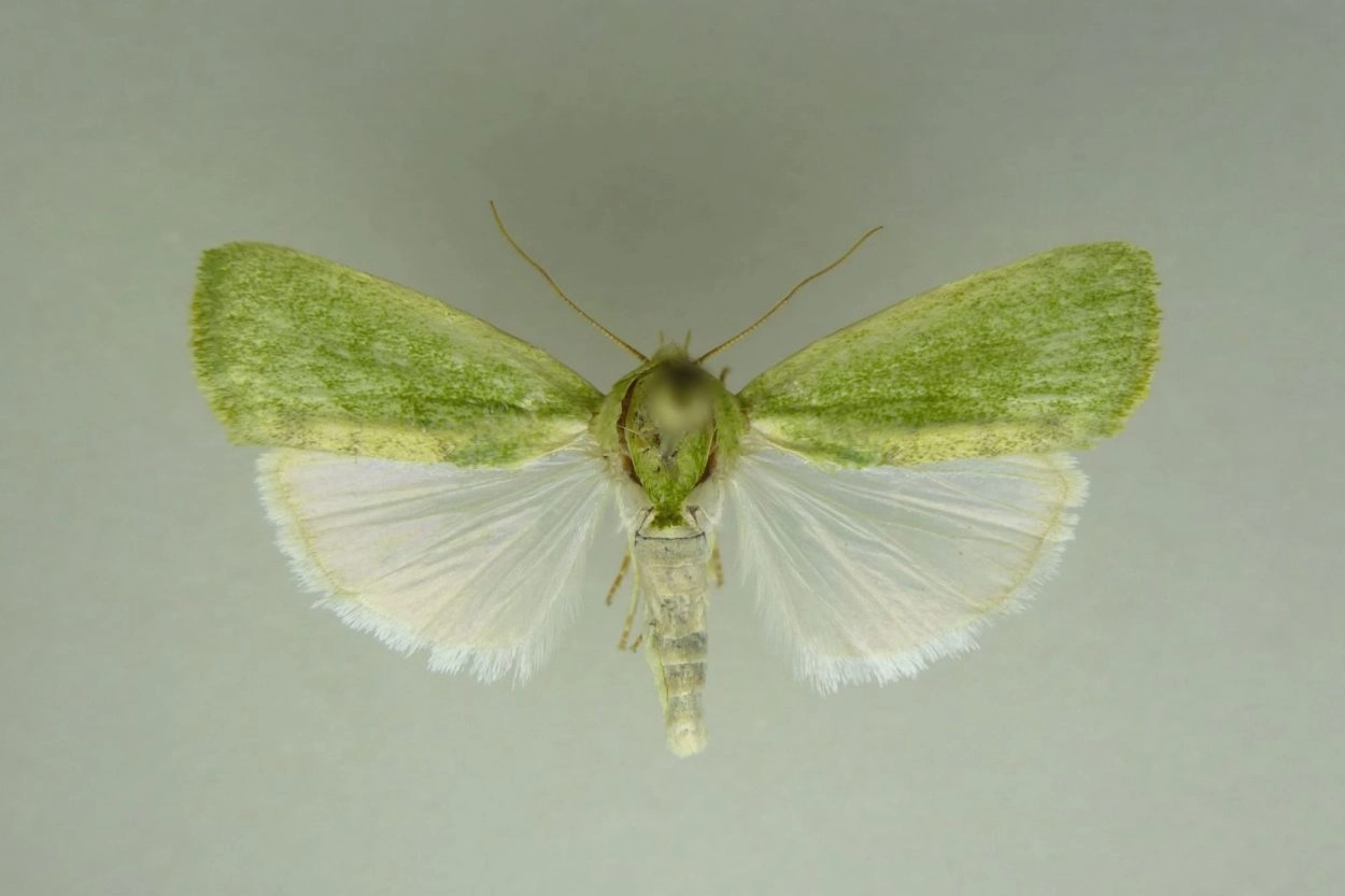Voorvleugellengte: 10-12 mm. Houdt in rust de vleugels onder een scherpe hoek in dakvorm. De voorvleugel heeft een doorgaans groene, soms ook bruingroene of licht grijsbruine kleur met vaag zichtbare, evenwijdig aan elkaar lopende donkere V-vormige dwarslijnen (waarvan het korte deel op de buitenste vleugelhelft vaak nauwelijks te zien is). Soms ligt er tussen twee van deze dwarslijnen een donker paarsachtig bruine zone waardoor er in rusthouding een opvallende bandvormige V over de beide vleugels is te zien. Een donkere vleugelzoom ontbreekt en de franje is doorgaans licht tot witachtig groen. De achtervleugel is wit.