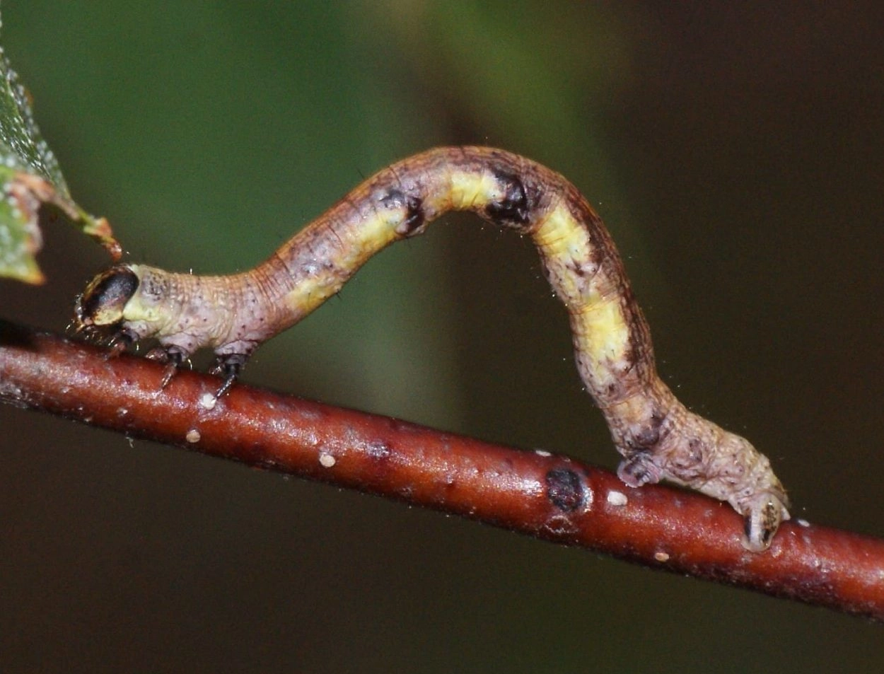 Donker klaverblaadje (Macaria alternata) en vierkantspikkelspanner (Paradarisa consonaria).N.B.: vergelijk behalve de uiterlijke kenmerken ook de tijd van het jaar waarin de rupsen voorkomen, het habitat en de waardplant(en).