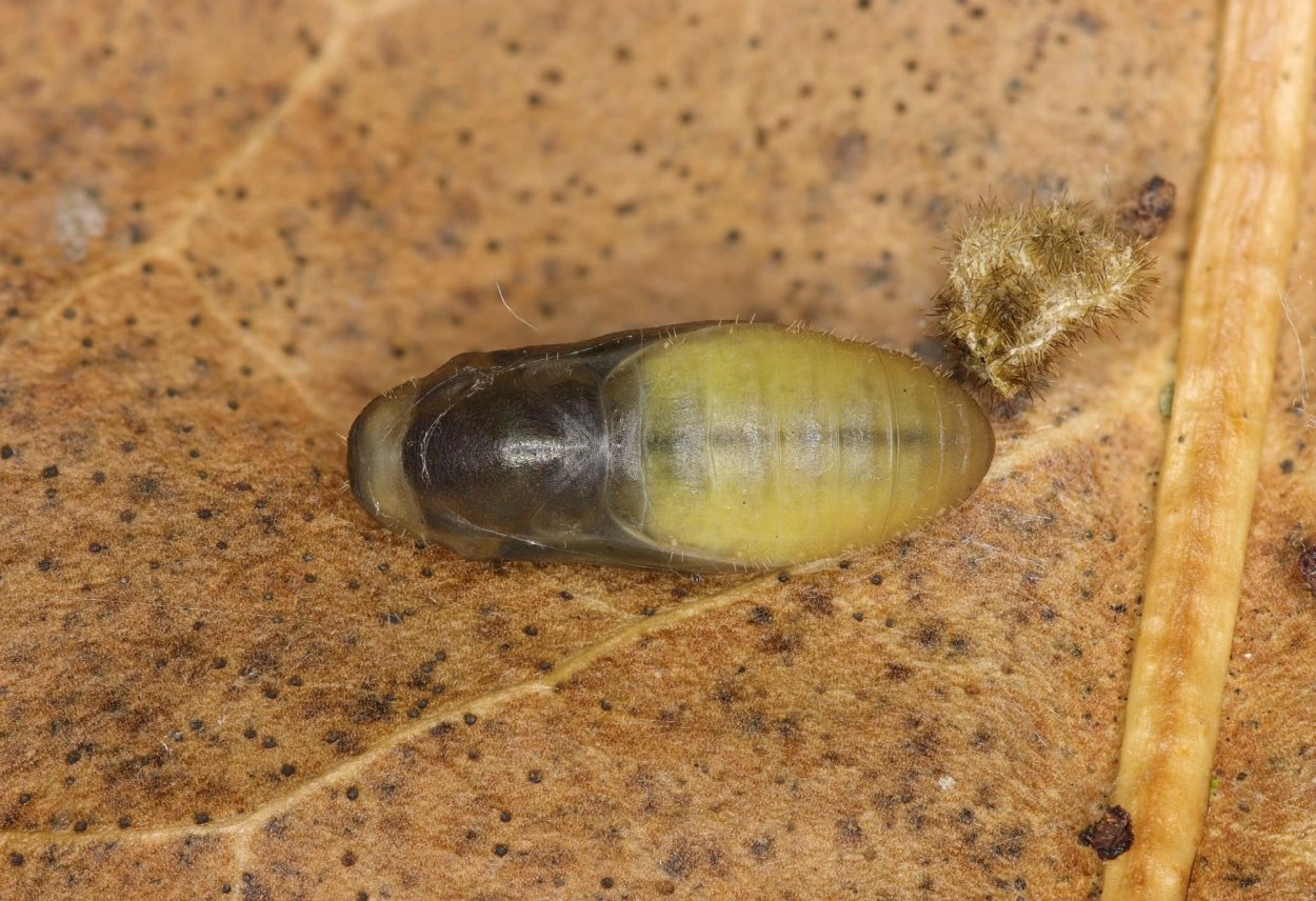 Tot 12 mm; dik en gedrongen, naar de uiteinden versmald en afgeplat naar de randen; lichaam bleek groen, soms met een zweem van oker, over de rug een donkergroene middenstreep en soms met meerdere donkere lengtestrepen over rug en flanken; kop glimmend zwart, in rust in het lichaam teruggetrokken.