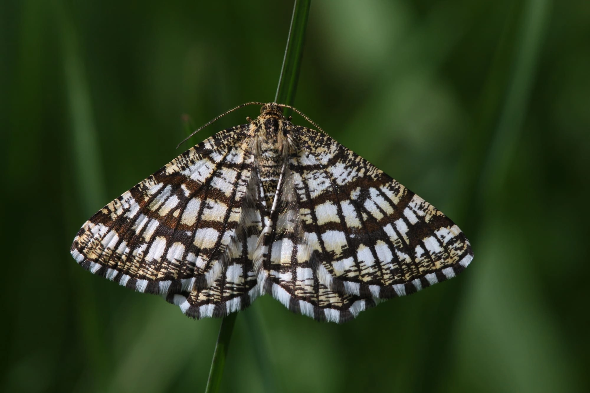 Voorvleugellengte: 11-15 mm. Karakteristiek is het netwerk van donkere dwarslijnen en vleugeladers aan de boven- en onderzijde van de vleugels. De breedte van de lijnen varieert sterk. De twee buitenste lijnen vloeien in het midden vaak samen. Kleur en tekening zijn variabel. Er zijn bijvoorbeeld exemplaren waarvan de vleugels, op de geblokte randen na, grotendeels donkerbruin zijn. Daarnaast komen ook vlinders voor waarvan de vleugels roomachtig geel zijn, zonder dwarsbanden. Ook worden soms exemplaren met een zuiver witte ondergrond waargenomen.