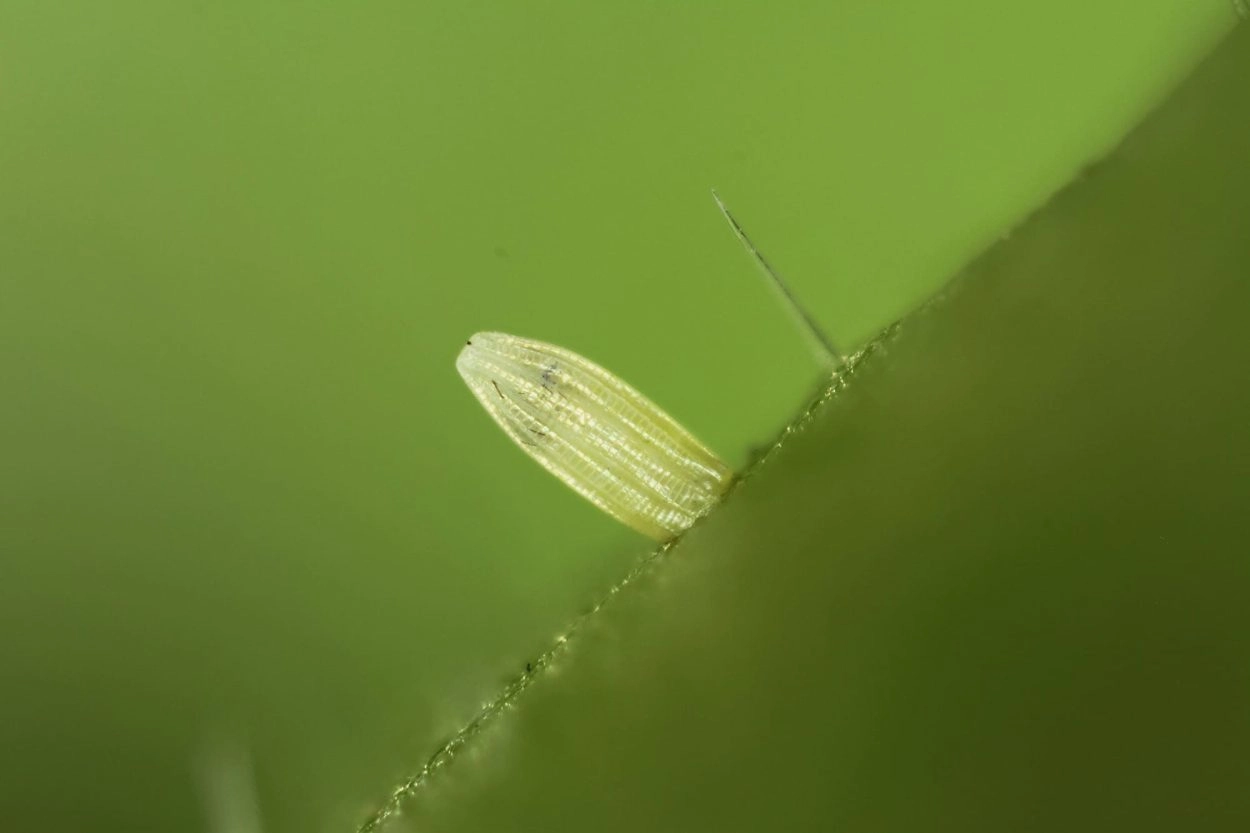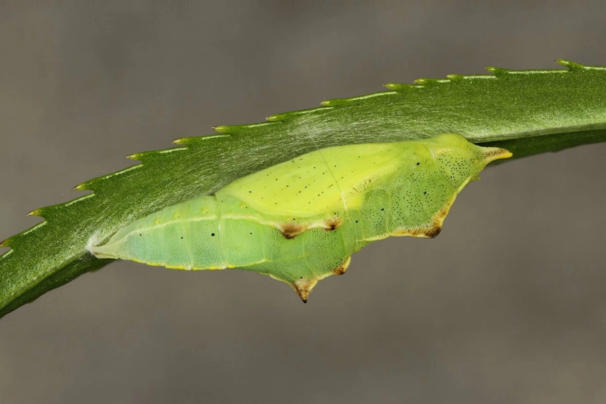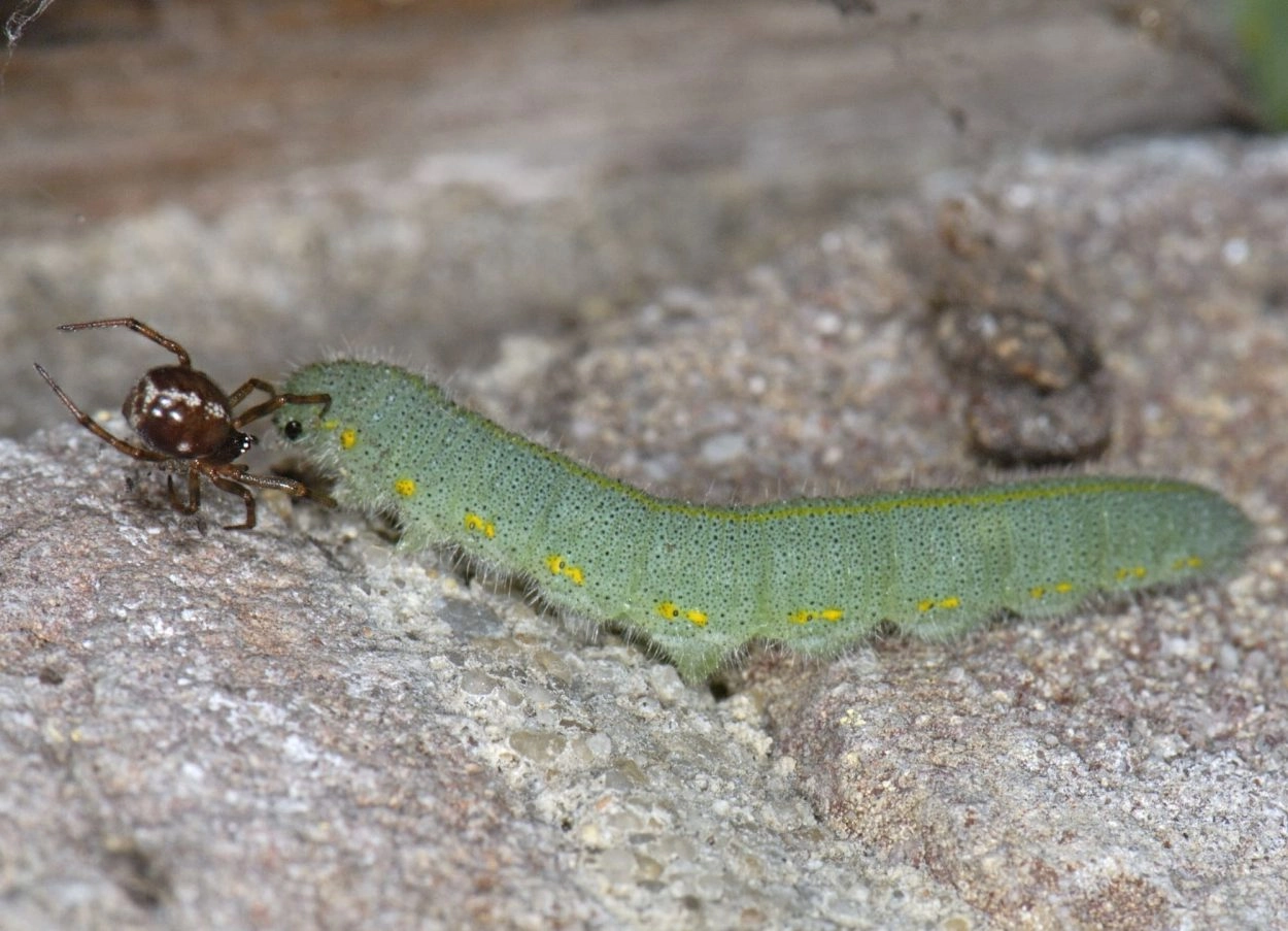 Tot 25 mm; lichaam groen overdekt met fijne korte haartjes, fijn zwart gespikkeld met een smalle, gele lengtestreep over het midden van de rug; een rij gele vlekjes langs de lijn van de witachtige, zwartgerande spiracula; kop groen.