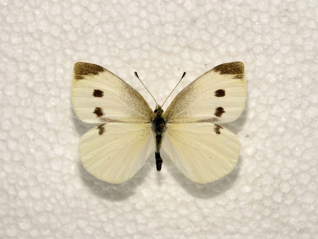 Klein geaderd witje (Pieris napi) en scheefbloemwitje (Pieris manii).N.B.: vergelijk behalve de uiterlijke kenmerken ook de tijd van het jaar waarin de rupsen voorkomen, het habitat en de waardplant(en).
