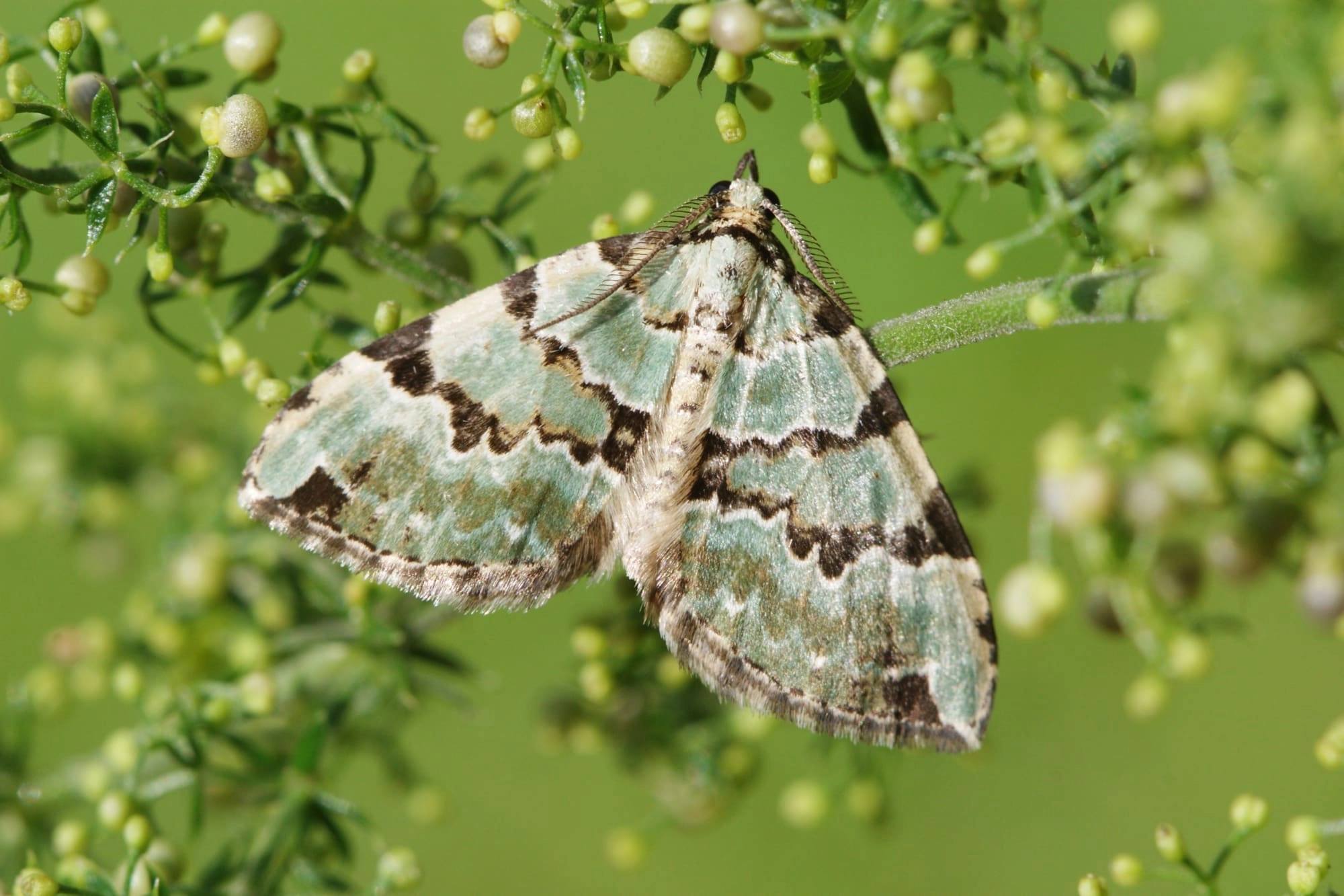 Voorvleugellengte: 12-15 mm. De soms iets blauwachtig groene grondkleur en de felgroene band maken verse exemplaren van deze spanner goed herkenbaar; de groene kleur verbleekt echter snel tot rozeachtig of bruinachtig wit. Een onderscheidend kenmerk, dat ook bij afgevlogen exemplaren goed te zien is, is het karakteristieke patroon van zwarte vlekken en dwarslijnen op de voorvleugel.