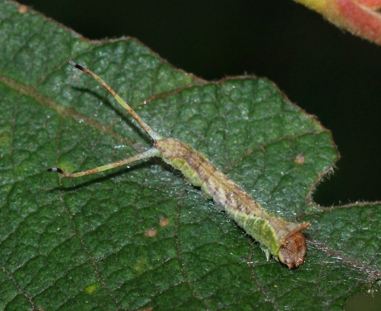 Tot 35 mm; lichaam vrij dik, versmald naar het achtereind, dat in twee lange staarten uitloopt; lichaam helder groen met een geelgezoomde, purperachtig bruine zadelvormige vlek op de rug, die op segment drie in een punt uitloopt; segment twee heeft een klein bultje op de rugzijde; kop purperachtig bruin met zwarte tekening op de achterzijde.
