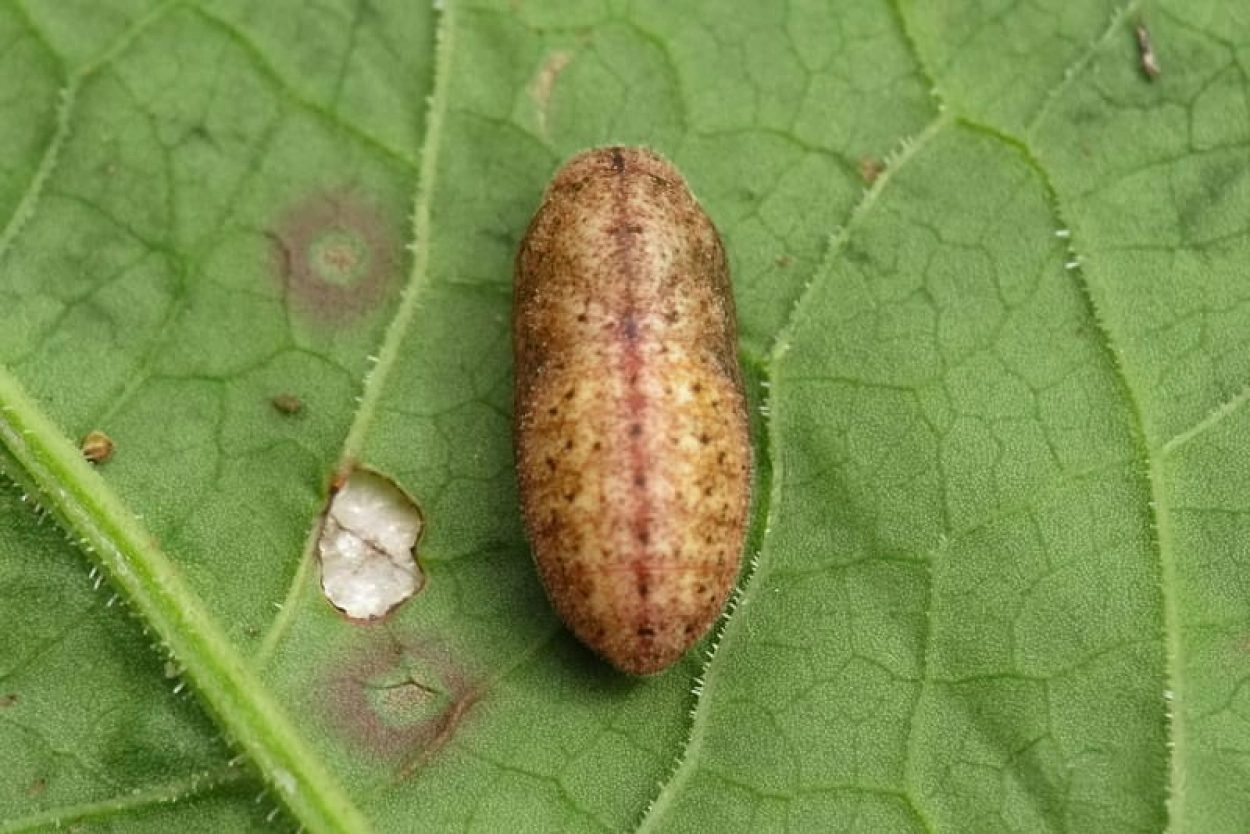 Tot 15 mm; kort en plomp, versmald naar de uiteinden; lichaam groen met een roze purperachtige rugstreep en een overeenkomstige streep onder de spiracula; de aanwezigheid en intensiteit van de roze-achtige tekening is bijzonder variabel; kop bruinachtig groen en in het lichaam teruggetrokken.