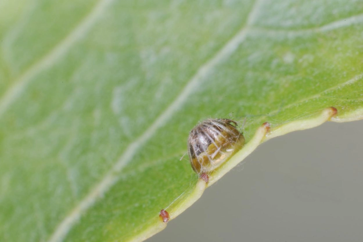 De eitjes worden op de bladeren afgezet. De rupsen komen omstreeks september uit en overwinteren op uiteenlopende plaatsen in een hibernaculum nabij de stam, een knop of op een blad dat zij stevig vast hebben gesponnen. Voor de overwintering verkleuren de rupsen van groen naar (licht)bruin. De pop hangt aan een blad.