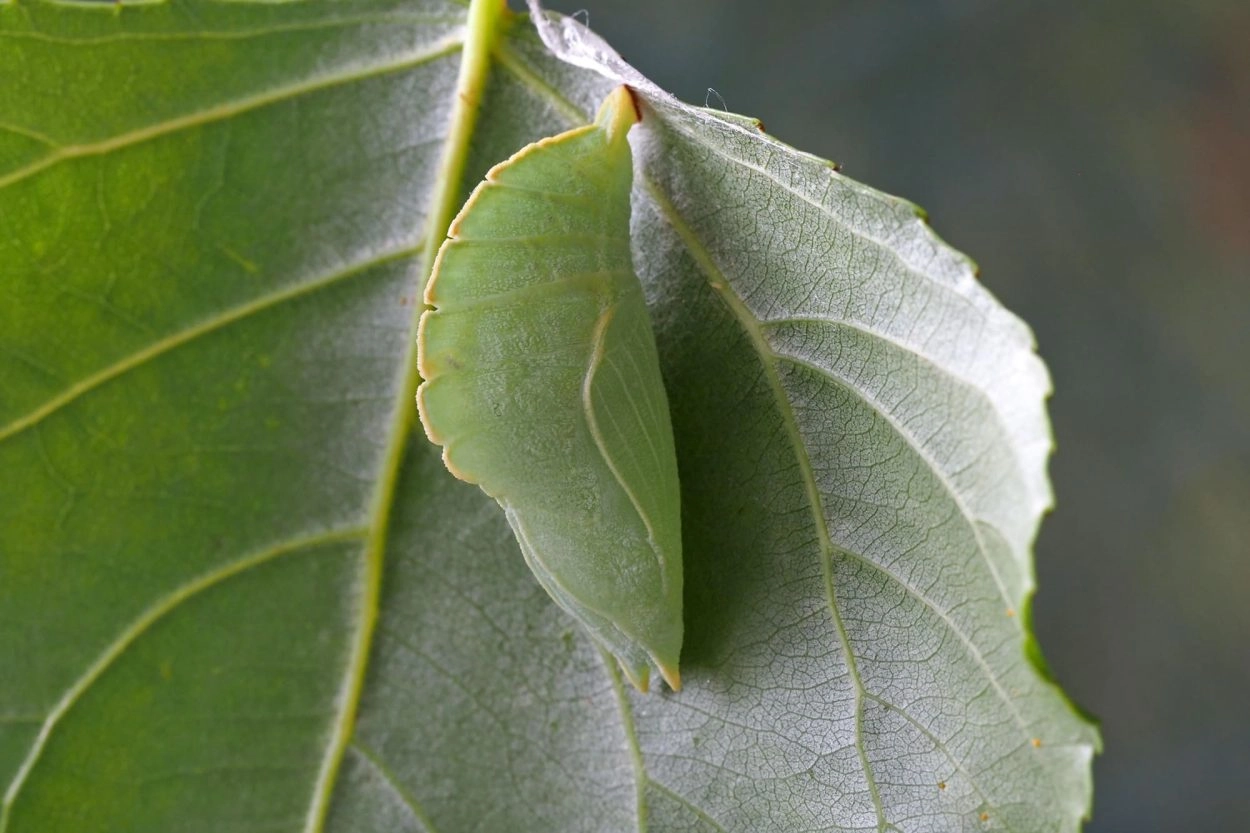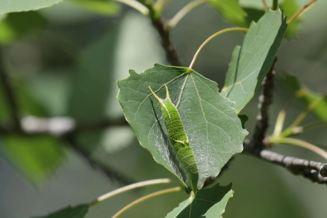 Tot 50 mm; lichaam versmald naar de staart, die in twee kleine tegen elkaar aan liggende en zo een punt vormende doorns uitloopt; groen met twee rood en gele lengtestrepen, die vanaf de kop tot aan het midden van de rug loopt; de achterhelft met een aantal schuine rood en gele strepen op de flanken; kop groen met twee lange, bruin gestreepte doorns, die aan de uiteinde gevorkt zijn.