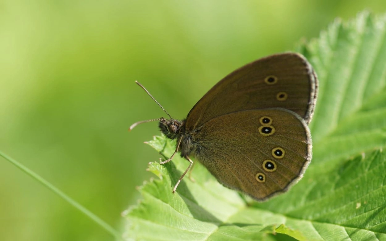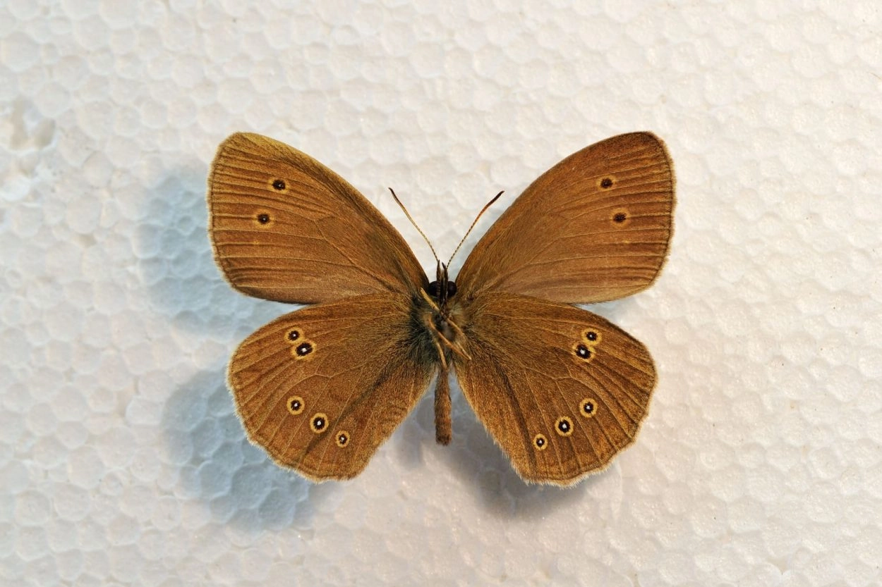 Voorvleugellengte: 18-24 mm. De bovenkant van de vleugels is zwartachtig bruin. De onderkant van de vleugels is donkerbruin met bij het vrouwtje een goudbruine bestuiving. Op de onderkant van de voorvleugel bevinden zich drie en op de onderkant van de achtervleugel vijf grote, witgekernde en geelgeringde oogvlekken. Bij het vrouwtje zijn de ogen soms ook zichtbaar op de bovenkant.