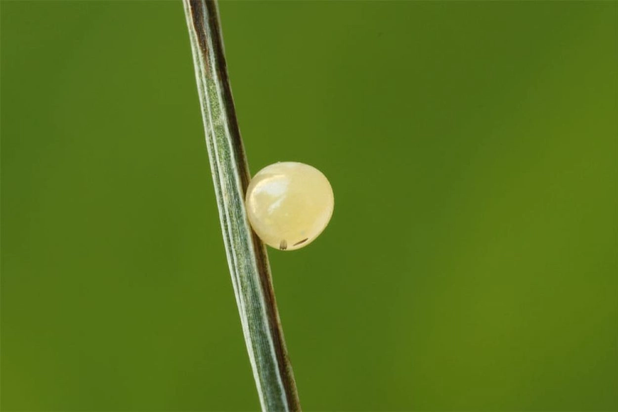 Het vrouwtje zet de eitjes af op grassen die groeien op vochtige plaatsen in hogere, ruige grazige vegetaties. Nadat zij is geland op een grasspriet of blad, loopt ze naar de rand en laat een eitje vallen, dat diep in de vegetatie terechtkomt. Het vrouwtje verspreidt de eitjes over een groot gebied en zwerft daarvoor soms over enige afstand.