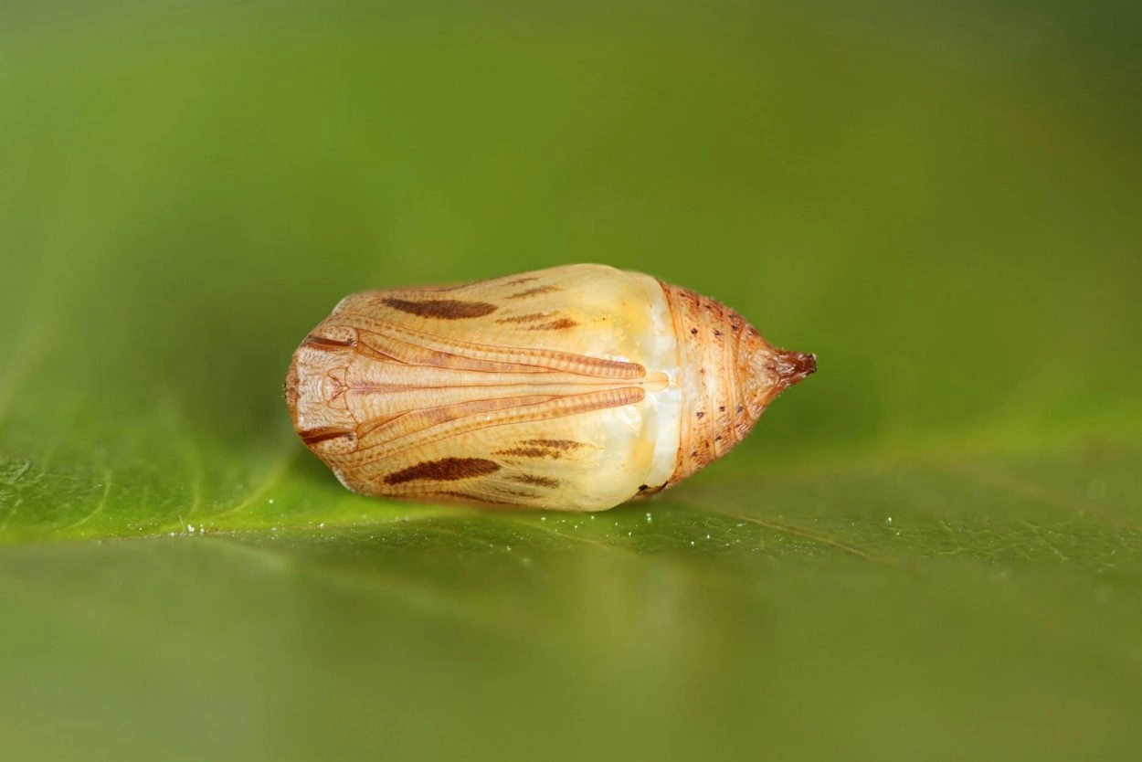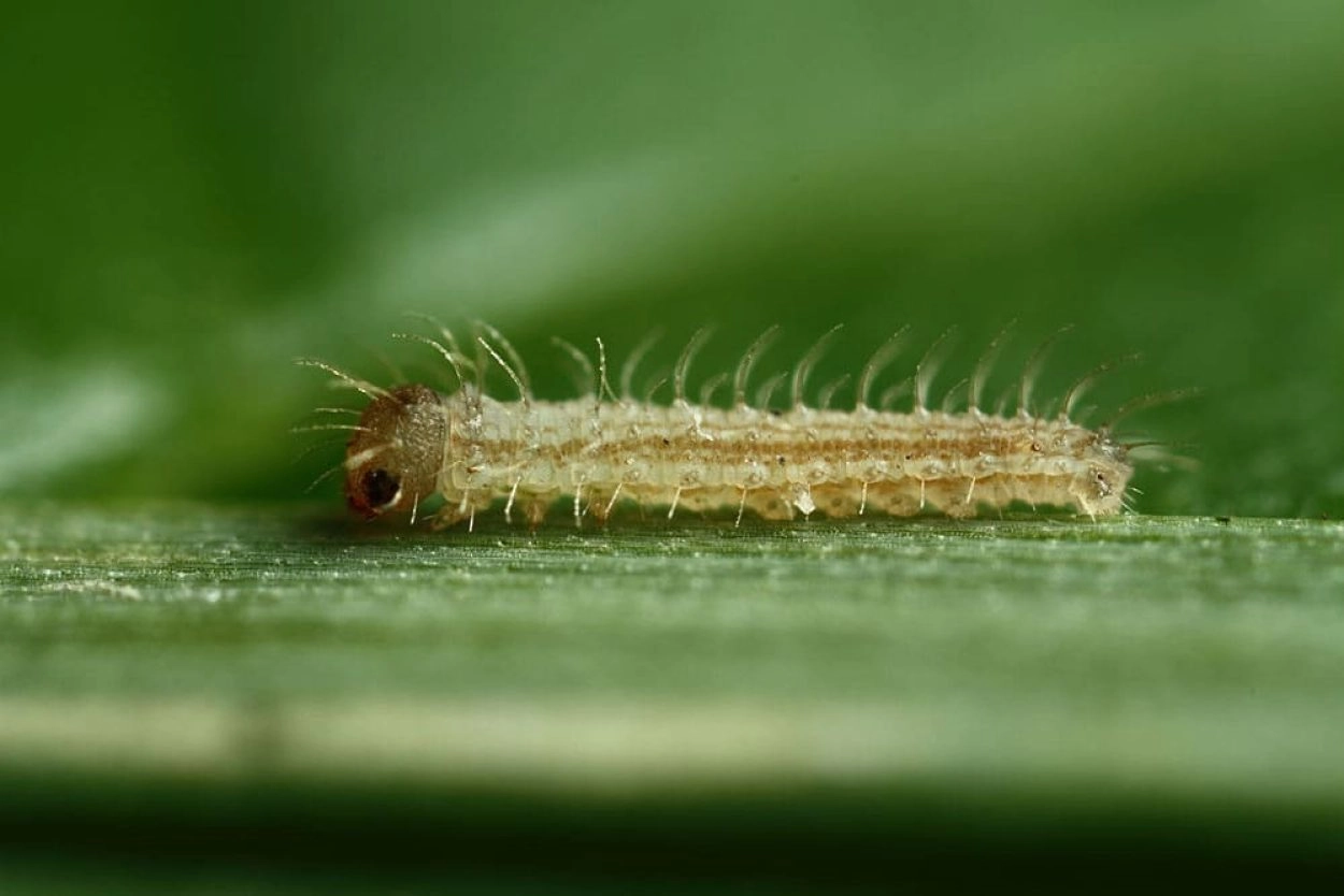 Tot 21 mm; vrij dik en naar de staart versmald; lichaam okerkleurig, met korte, donkere borstelhaartjes overdekt, een donkere middenstreep over de rug en onder de spiracula een witte lengtestreep met daaronder een onregelmatige, zwartachtig bruine lengtestreep; kop roodachtig bruin.