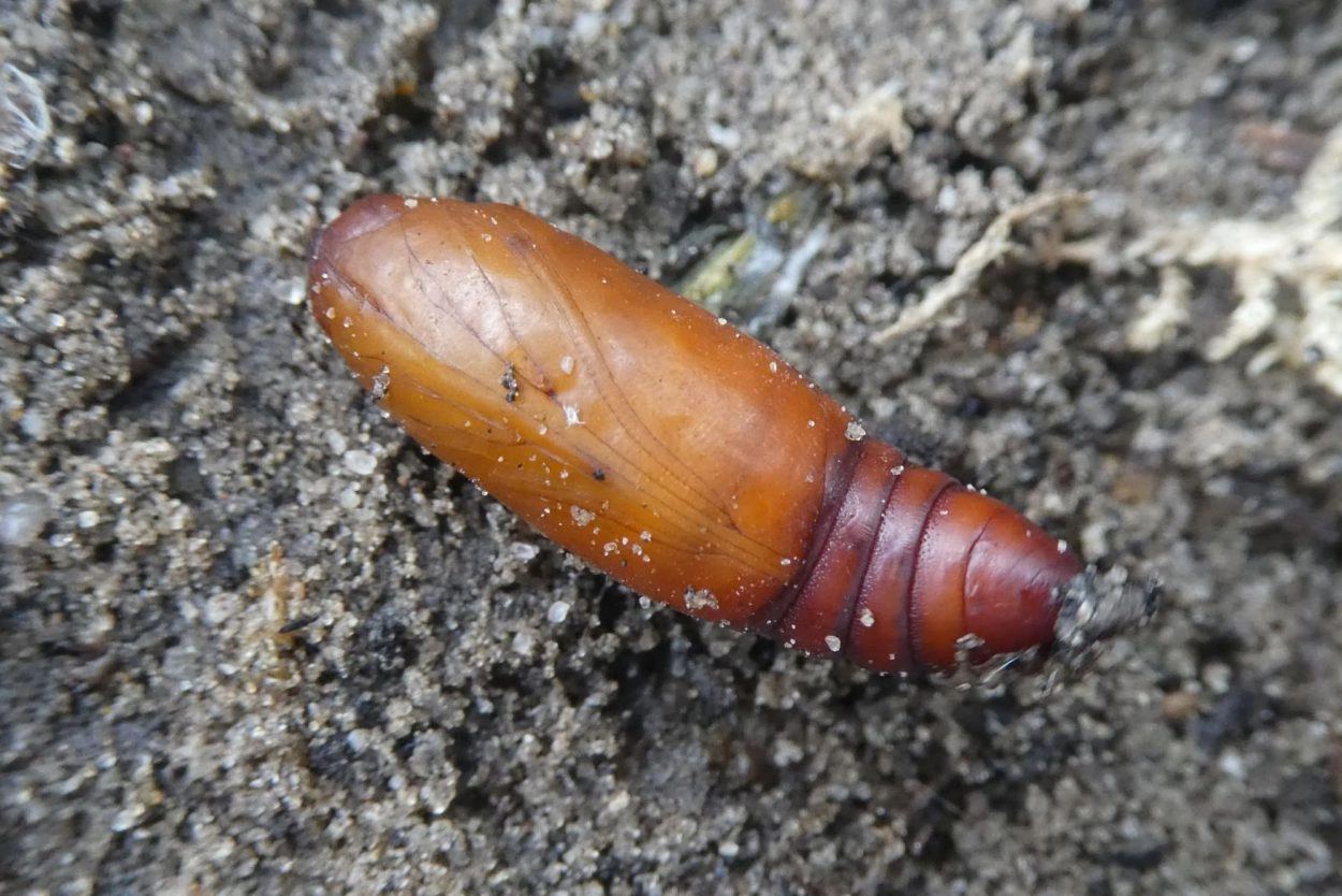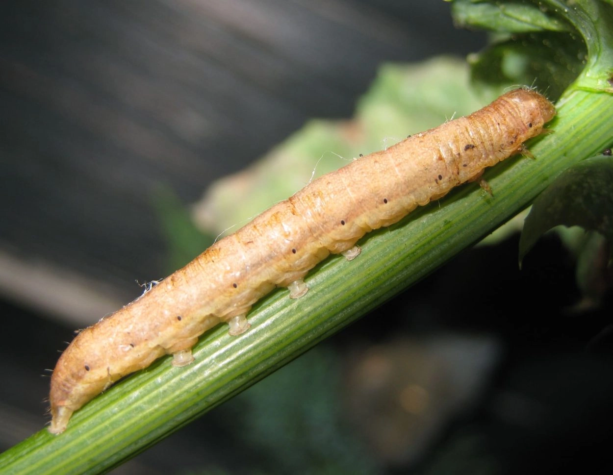 Tot 30 mm; lichaam okerkleurig of bleek roodachtig bruin met zwarte vlekjes, bleek groenachtig onder de lijn van de spiracula; soms met drie fijne, zwartachtige lengtestrepen over de rug; kop bleek geelachtig bruin.
