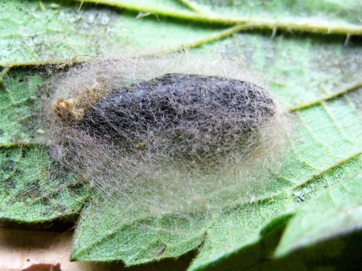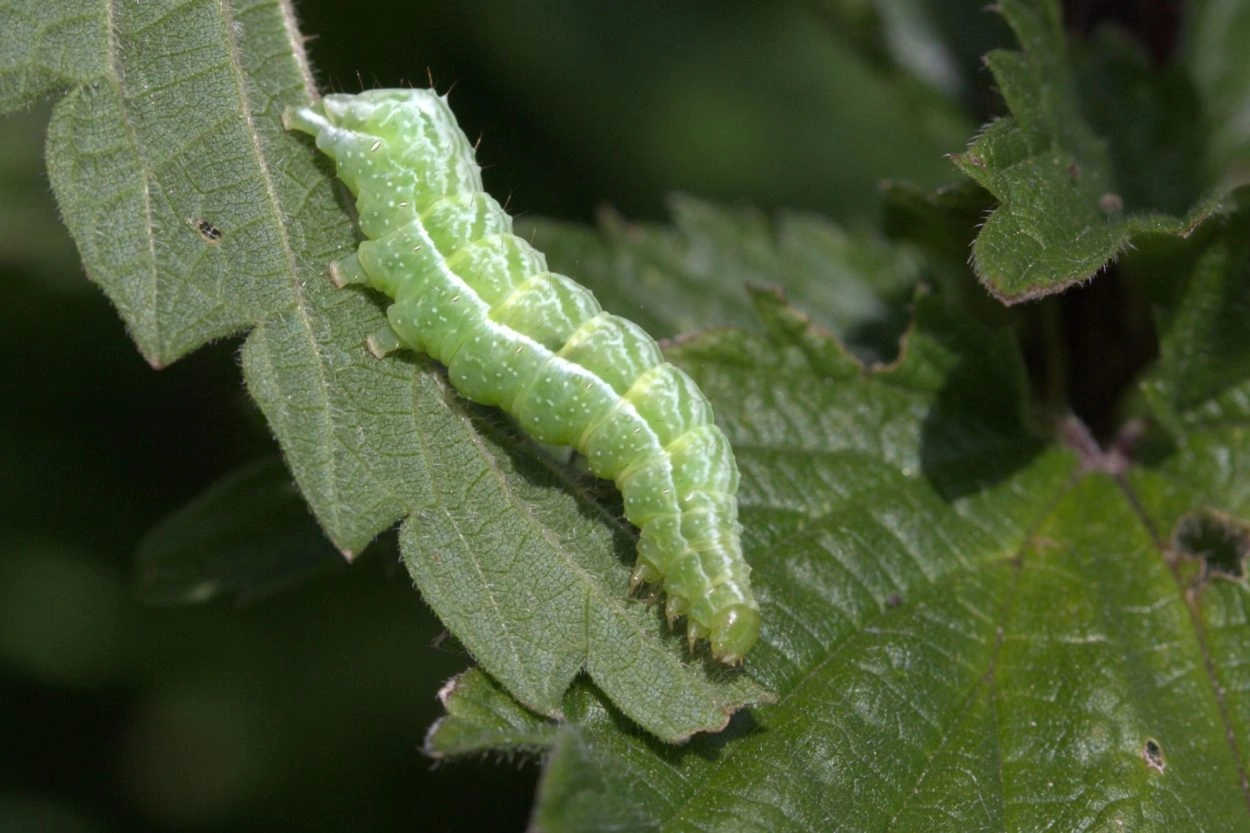 Tot 35 mm; een 'semi-spanrups' met slechts twee paar buikpoten; lichaam bleek blauwachtig groen met over de rug een rij witachtige, pijlvormige vlekken en langs de zwartgerande spiracula een witachtige lengtestreep; kop geelachtig groen.