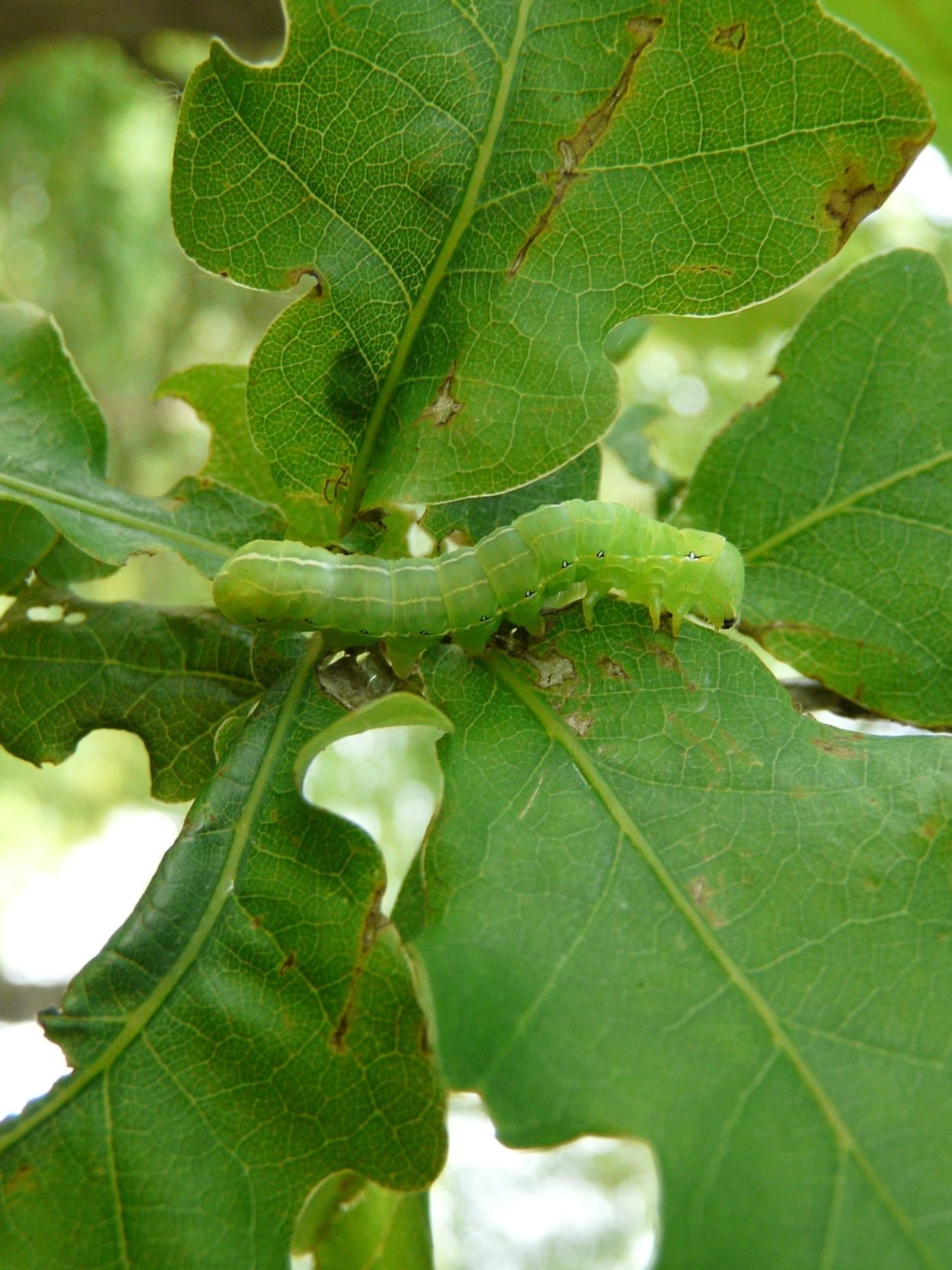 Tot 50 mm; plomp, met op de rug van het elfde segment een duidelijke bult; lichaam helder groen met over de rug drie geelachtig witte lengtestrepen en vlak achter de kop een witachtige dwarsband; over de zwartgerande spiracula een geelachtig witte lengtestreep.