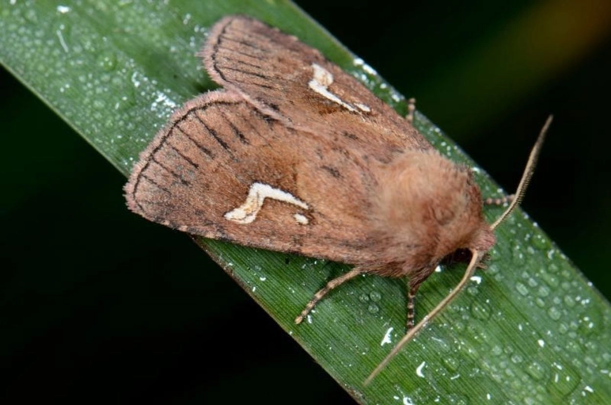 Deze vrij kleine uil is te herkennen aan de opvallende 'boemerang-vormige' witte niervlek, waarvan de binnenste punt naar de vleugelwortel wijst tot voorbij de eveneens witte ringvlek.