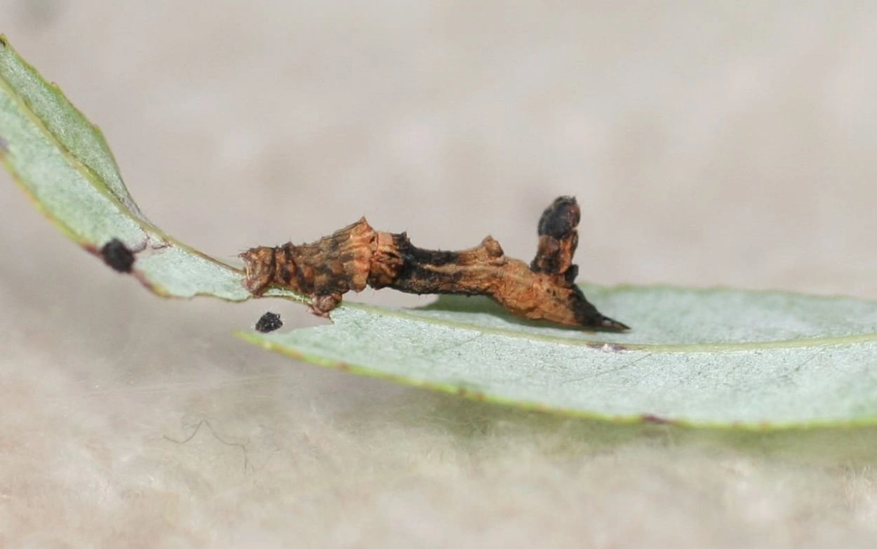 Tot 38 mm; lichaam varieert in kleur van donker grijsachtig bruin tot groenachtig bruin of licht roodachtig bruin; het derde paar poten van de thorax is knopvormig; op de rugzijden van de segmenten vijf en acht dubbele, wratachtige uitwassen; kop zwart of bruin, vrij plat en vierhoekig in uiterlijk.