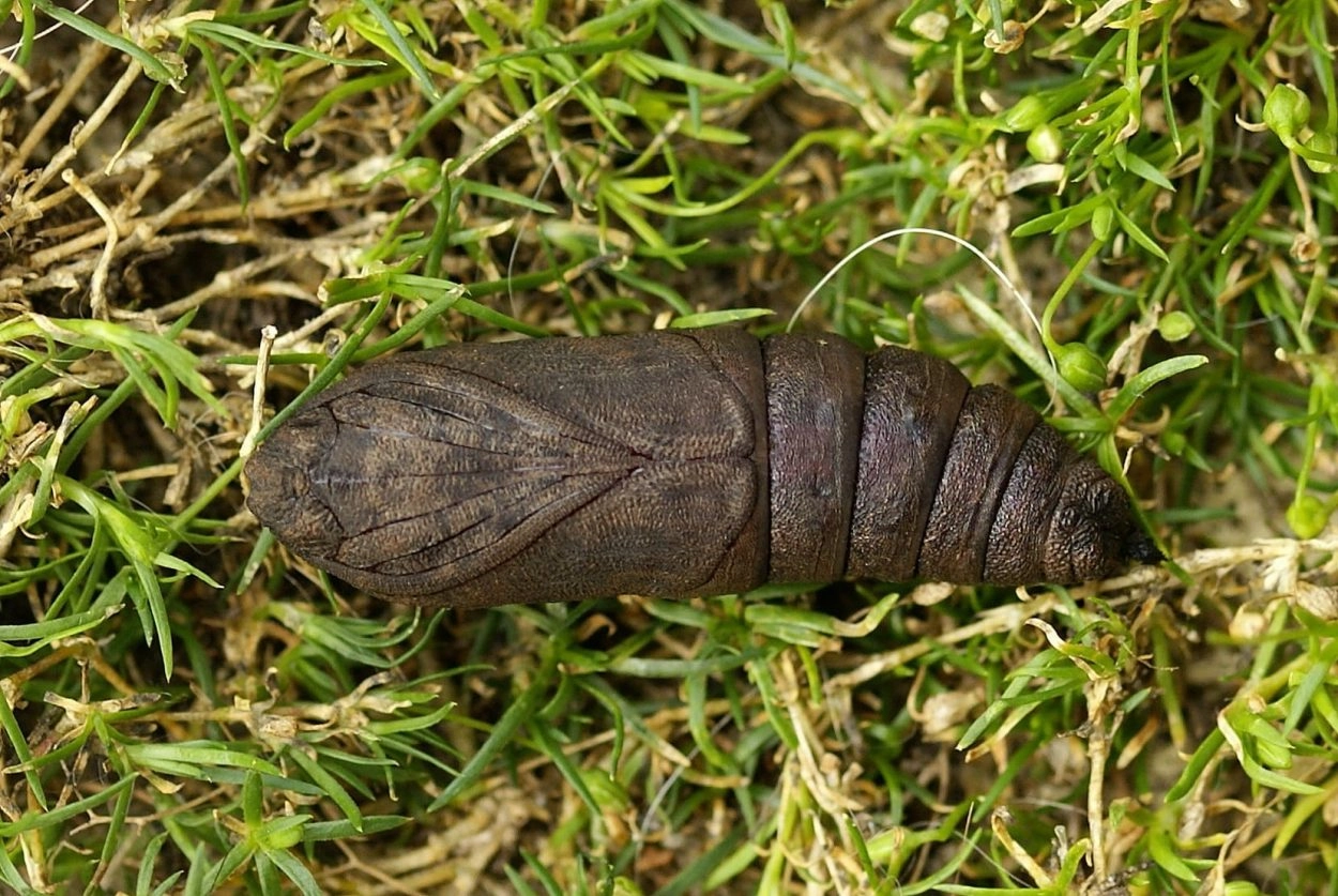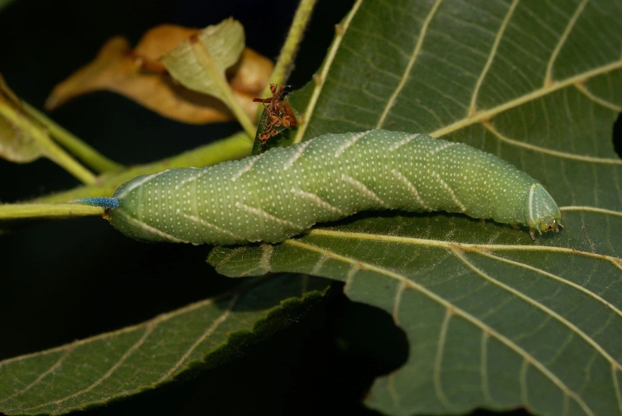 Tot 60 mm; lichaam groen, fijn geelachtig wit gespikkeld, met op de flanken zeven gele schuine strepen; spiracula wit met rode rand; hoorn op het elfde segment geel en purperachtig rood met blauw uiteinde; het dertiende segment draagt een duidelijk ruw gekorreld, geel schildje met purperachtig bruine tekening; kop driehoekig, groen met witte strepen. Tegen de tijd van verpopping verkleurt de rups naar purperachtig bruin.