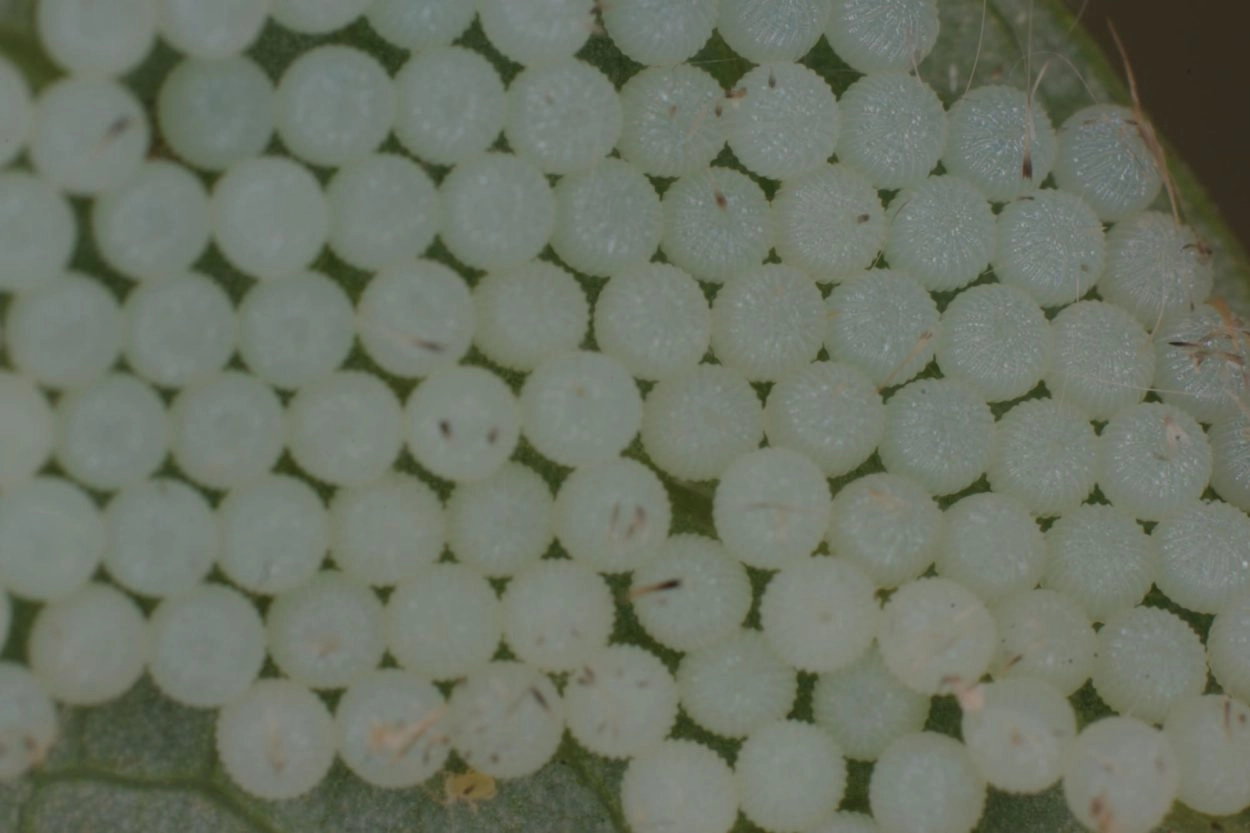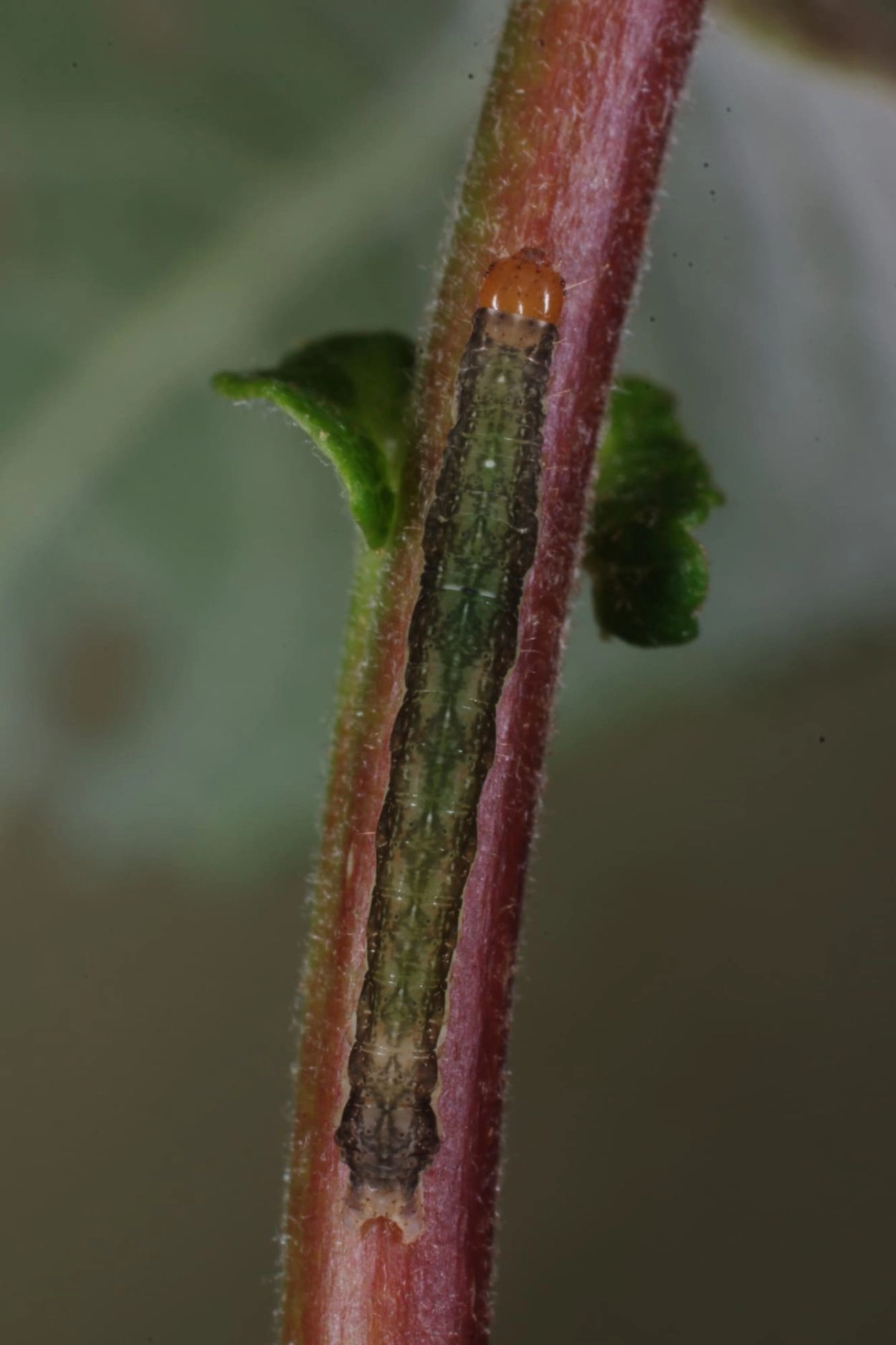 Tot 50 mm: lichaam geelachtig bruin tot grijsachtig bruin met over de rug een rij zwartachtige, ruitvormige vlekken, aan weerszijden daarvan een rij scheve balkjes; spiracula oranje; kop geelachtig bruin met donkerder tekening.