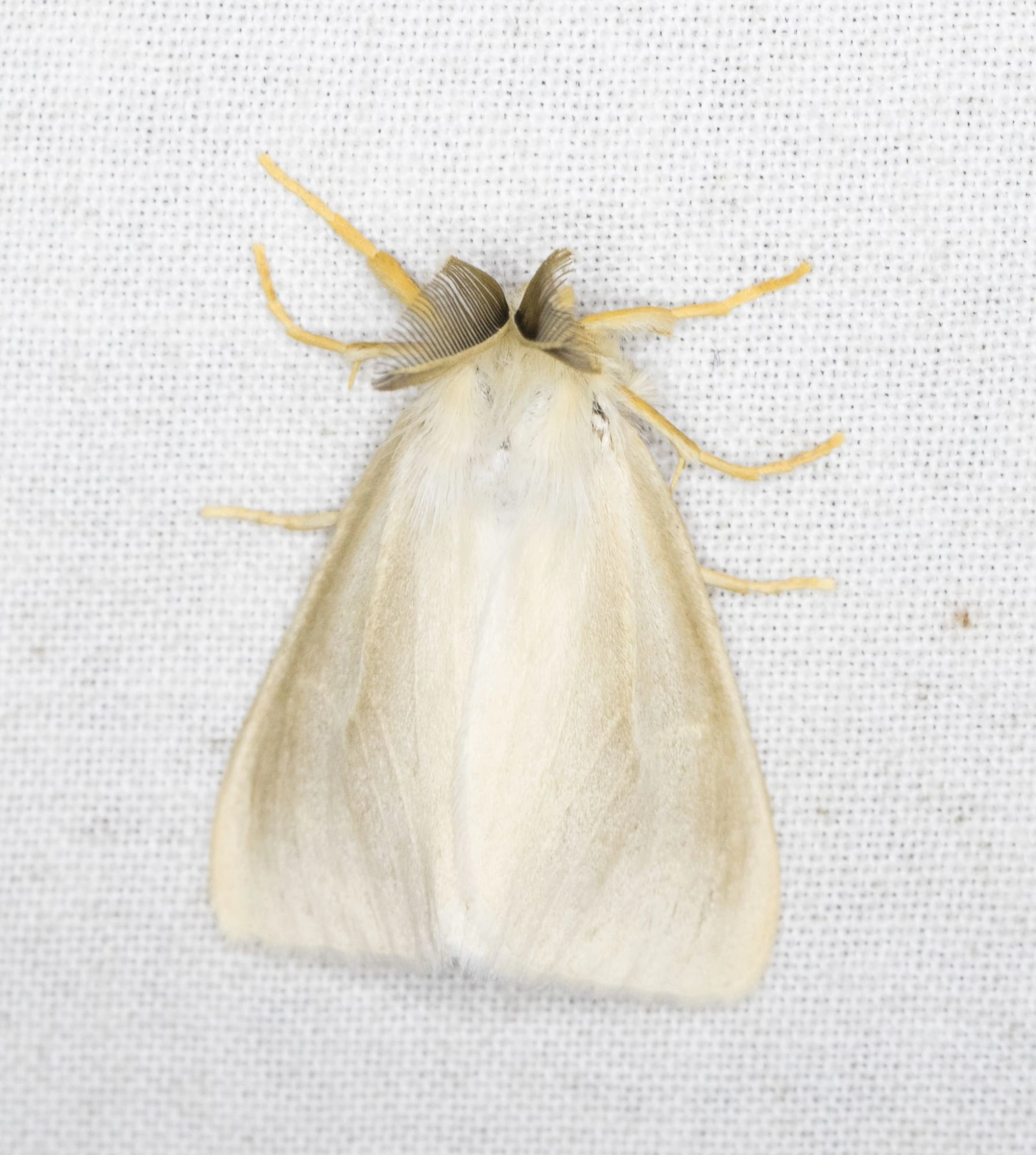 Voorvleugellengte: 16-21 mm. De sterk geveerde, opvallend zwarte antennen en de bleke bruingele voorvleugel van het mannetje vormen een kenmerkende combinatie. De enige tekening op de voorvleugel bestaat uit een gebogen rij vage zwartachtige stipjes vlak bij de binnenrandhoek. Het vrouwtje heeft een ongetekende witte voorvleugel en ongeveerde antennen.