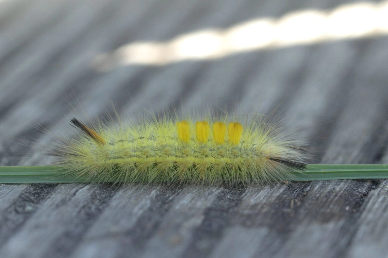 Tot 35 mm; lichaam vuilokerachtig bruin, bedekt met okerkleurige haarborstels, die op kleine wratjes staan ingeplant; de segmenten vier tot zeven elk met een haarborstel op het midden van de rug; segment een met een paar naar voren wijzende borstels van gepluimde zwarte haren en segment elf met een identieke haarborstel, die op het midden van de rug staat en naar achteren wijst; kop bruin.