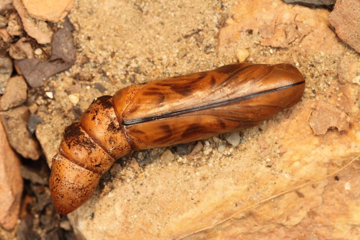 Tot 100 mm; kop klein, lichaam naar voren taps toelopend vanaf buiksegment 1. Rest van lichaam bijna cilindrisch. Heeft gewoonlijk een prominente lichtblauwe tot blauwe oogvlek op het derde segment en een bleke tot witte dorsolaterale lijn vanaf buiksegment 1 naar de hoorn. Hoorn stevig en naar beneden gebogen in laatste stadium. Lichaam bruin en glad in laatste stadium.