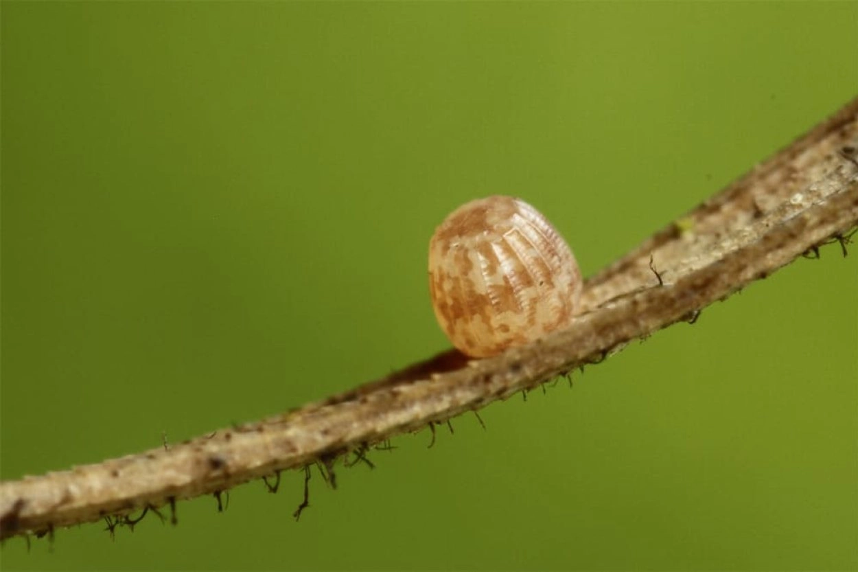Een vrouwtje op zoek naar een afzetplaats voor de eitjes vliegt laag over de vegetatie en er soms zelfs doorheen. Als een geschikte plek is gevonden, kruipt zij diep in de vegetatie, kromt het achterlijf en schiet de eitjes een voor een af. Deze blijven aan grassprieten kleven of vallen op de grond. Het komt ook voor dat eitjes doelgericht op een waardplant worden afgezet. Het vrouwtje zorgt dat de eitjes niet te dicht bij elkaar liggen.