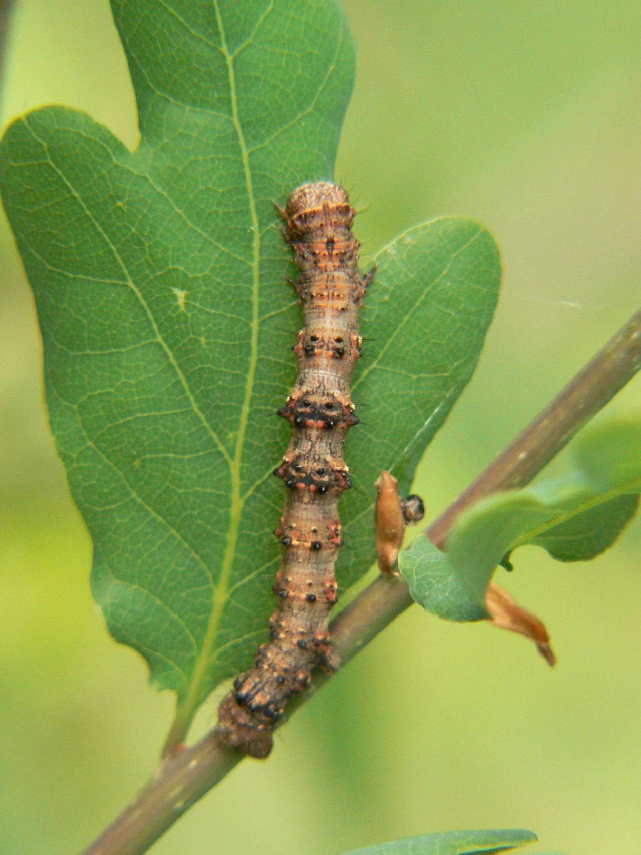 Voorjaarsspanner (Apocheima hispidaria).N.B.: vergelijk behalve de uiterlijke kenmerken ook de tijd van het jaar waarin de rupsen voorkomen, het habitat en de waardplant(en).