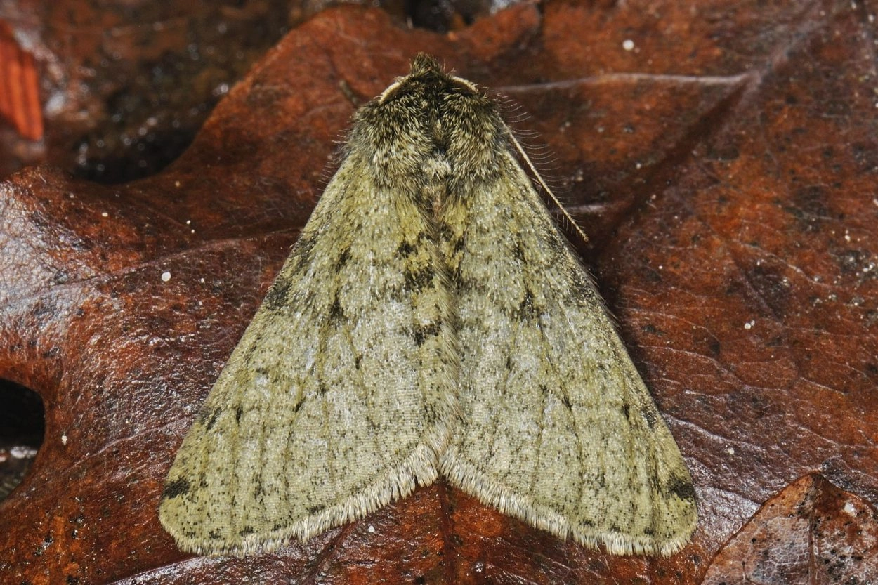 Tot 38 mm; dik, versmald naar de kop; lichaam grijsachtig bruin of groenachtig bruin met roodachtig bruine tekening; rug en flanken met kleine, kegelvormige wratjes, waarop de haren staan ingeplant; op de segmenten vijf, zes, zeven en twaalf zijn deze wratjes het meest geprononceerd; kop grijsachtig of groenachtig bruin.