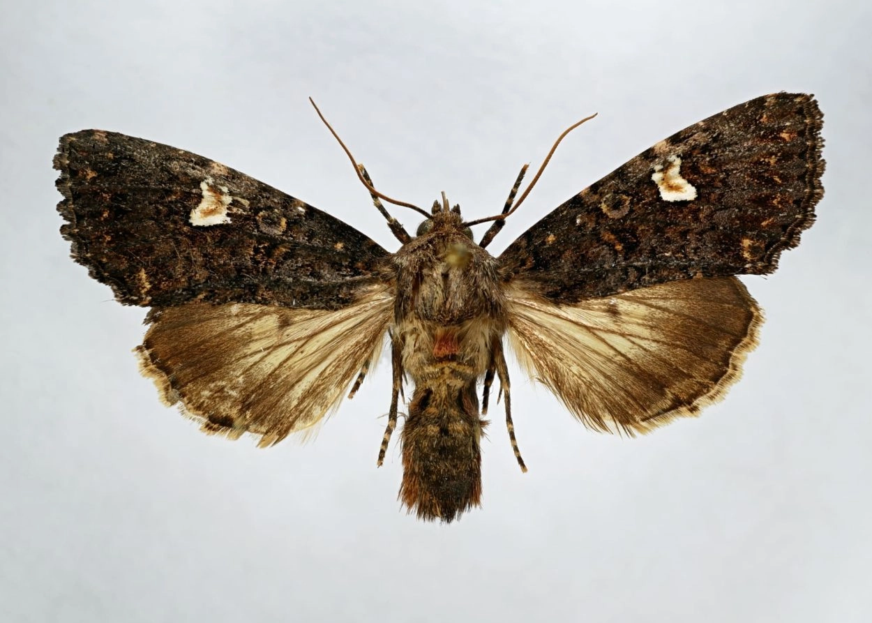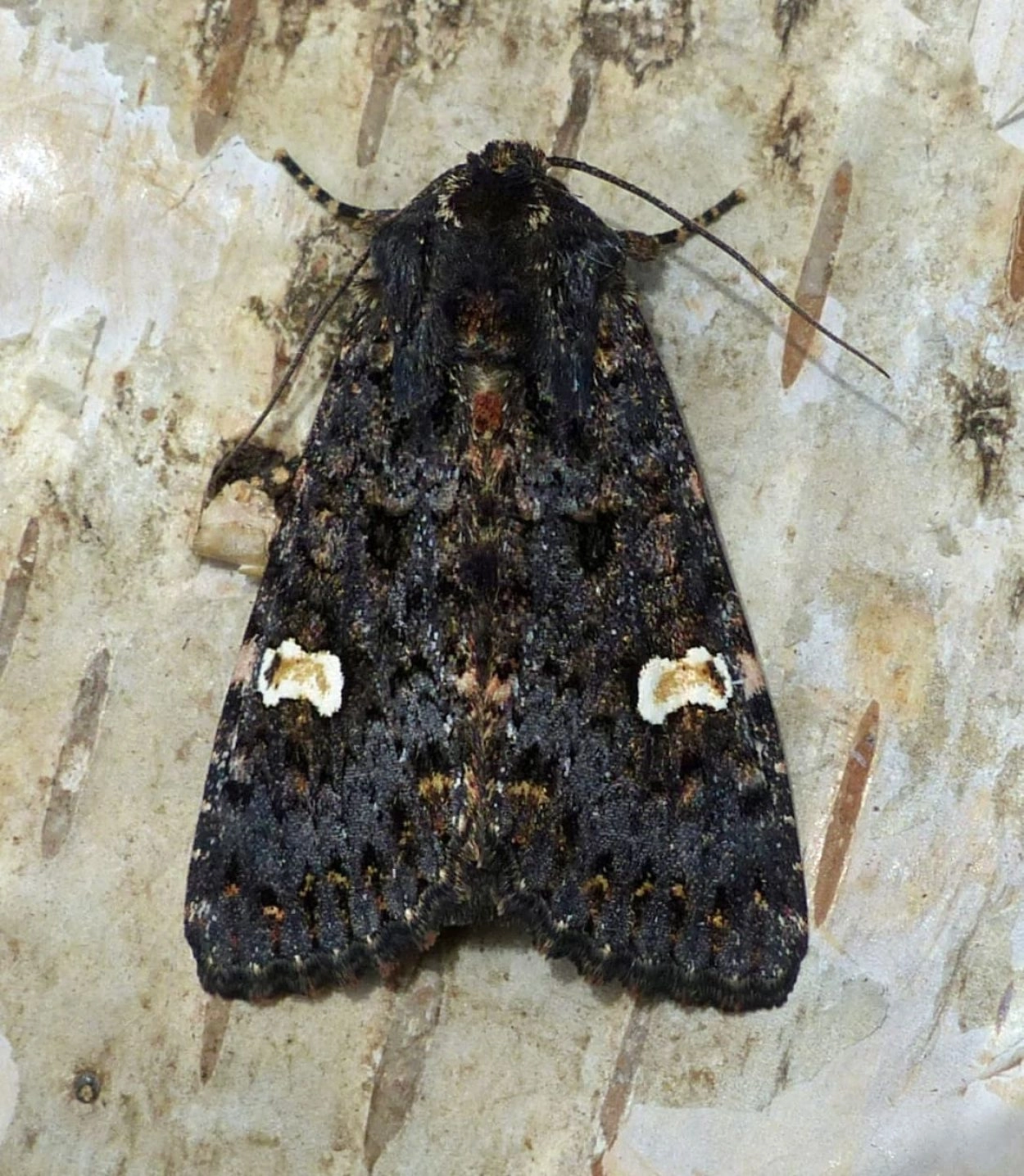 Voorvleugellengte: 16-21 mm. Deze uil is meestal te herkennen aan de opvallende witte niervlek die fel afsteekt tegen de glanzende zwartachtige voorvleugel en waarin vaak een grijsachtig half maantje te zien is. Er zijn echter ook exemplaren zonder opvallende witte niervlek. Ook de lichte golflijn en de vlekjes langs de voorrand zijn doorgaans goed zichtbaar; verder is de tekening slechts vaag zichtbaar. De kleur kan enigszins variëren; soms is de voorvleugel blauw- of bruinachtig getint. Op het borststuk bevindt zich een bosje roodbruine haren.