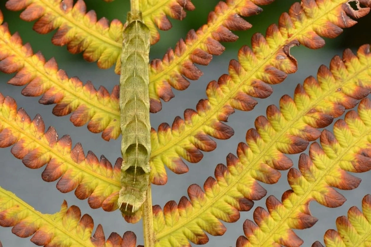 Tot 40 mm; lichaam varieert in kleur van purperachtig bruin tot groen; segment elf met een duidelijke bult; over de rug een witte middenstreep, die door een rij donkere, V-vormige vlekken loopt, die vooral op de segmenten vier, vijf en elf zeer opvallend zijn; vanaf elk spiraculum een schuine, neerwaartse, donkere streep; kop lichtbruin.