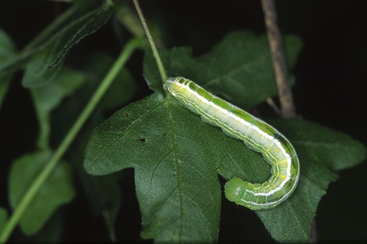 Tot 30 mm; lichaam bleek blauwachtig groen met bleek geelachtig groene lijnen tussen de segmenten; over de rug twee brede, groenachtig witte lengtestrepen en over de spiracula een geelachtige lengtestreep; kop groen.