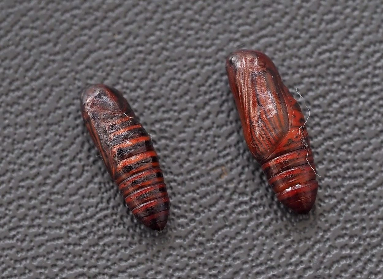 Tot 30 mm; lichaam grijsachtig met over rug en flanken brede, geelachtig witte lengtestrepen; over de rugzijde van elk segment een aantal zwarte en oranjerode dwarsbanden; lange, grijze en zwarte haren op kleine, verheven wratjes; kop helder roodachtig bruin met een witachtige Y-vormige tekening.