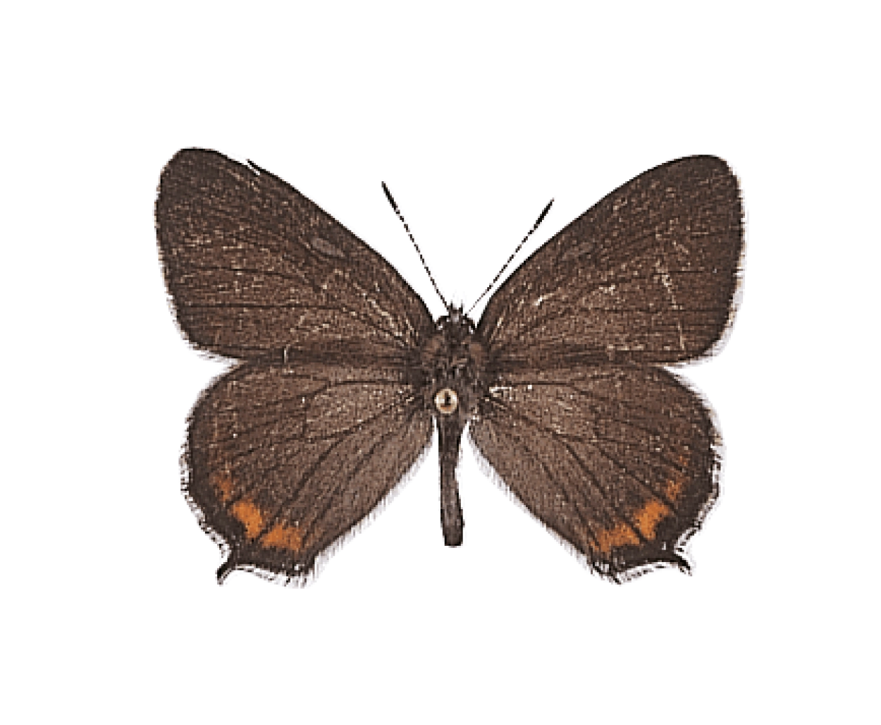 Voorvleugellengte: circa 15 mm. De grondkleur van de bovenkant van de vleugels is donkerbruin. Het iets grotere vrouwtje is lichter van kleur en heeft op de bovenkant van de voorvleugel een oranje veeg die bij het mannetje ontbreekt. Langs de achterrand van de onderkant van de achtervleugel bevindt zich een heldere, oranje band die aan de binnenzijde met opvallende zwarte vlekken is afgezet; de oranje vlekken hebben geen duidelijke halvemaanvorm. De witte lijn lijkt soms op een W; deze W is echter niet duidelijk en heeft gebogen zijkanten. De achtervleugel heeft een klein staartje; bij het staartje bevinden zich een of twee blauwe vlekjes.