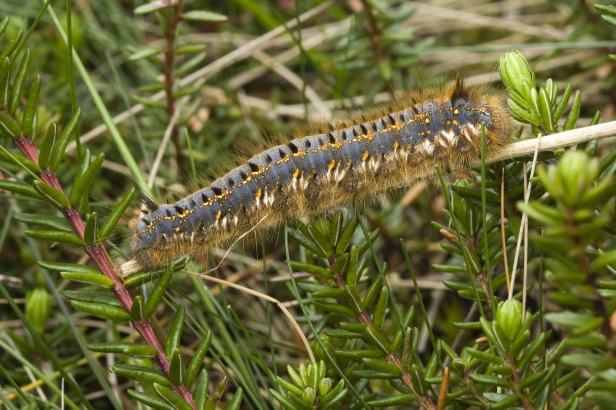 Tot 75 mm; lichaam blauwachtig grijs op de rug, zwart op de flanken, overdekt met bleek roodachtig bruine haren; over de rug een dunbbele rij van kleine, zwarte haarbosjes; op de segmenten twee en elf een langere zwarte haarpenseel op het midden van de rug; boven de spiracula een brede band van oranje-rode vlekken, onder de spiracula een rij witte haarbosjes en roodachtige vlekken; kop zwart met roodachtige tekening.