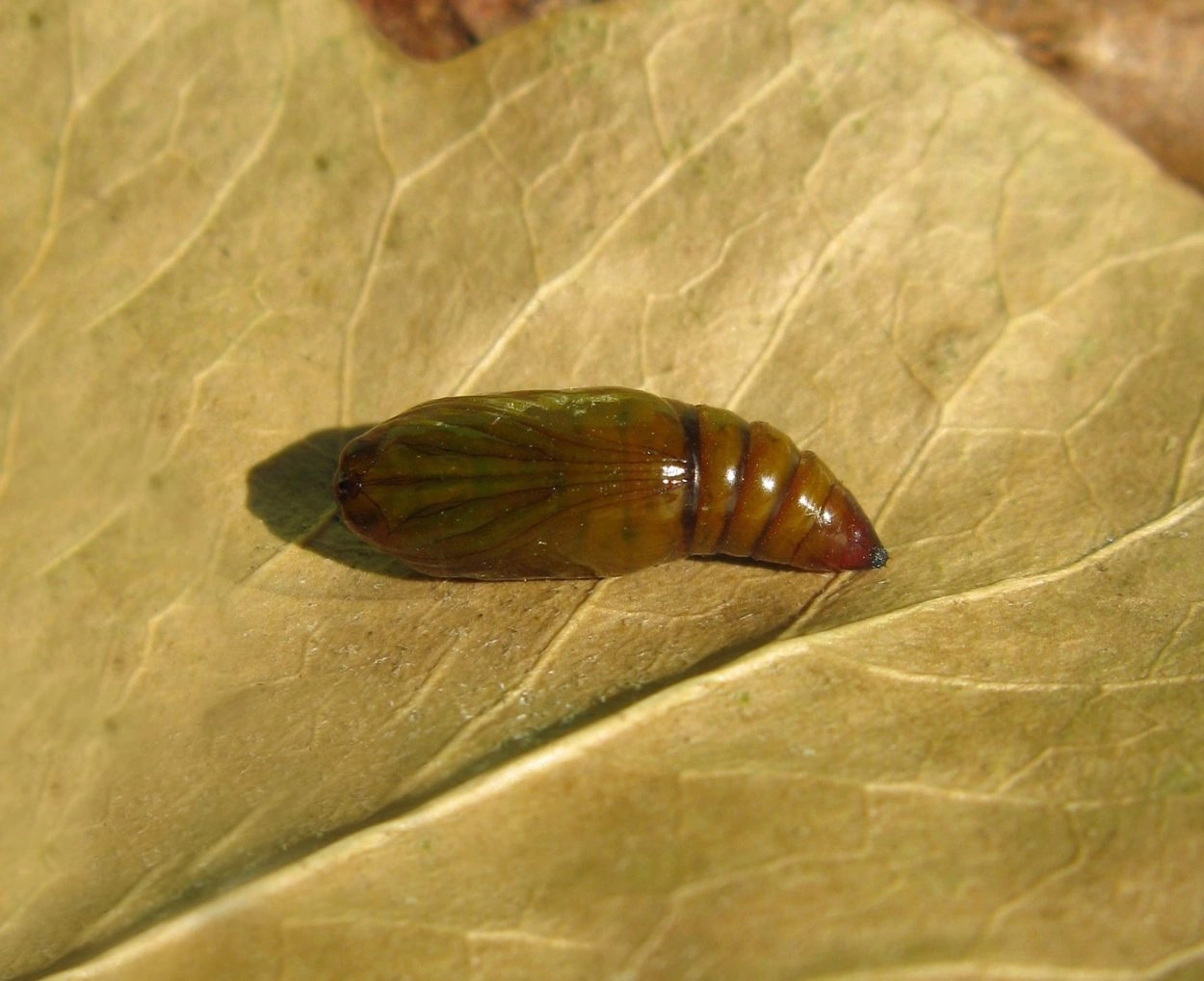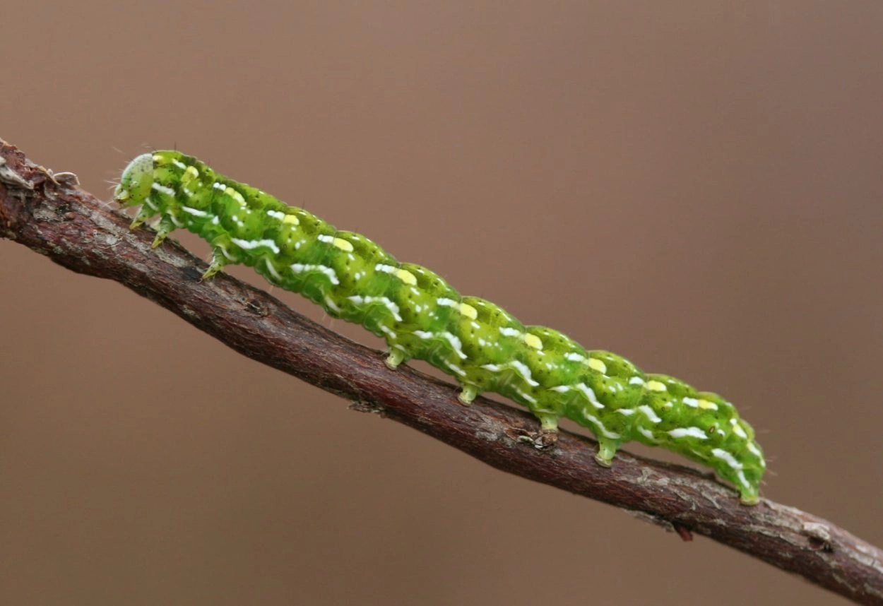 Tot 30 mm; lichaam donkergroen tot helder geelachtig groen met witte spikkels; over de rug een lengtestreep van geelgekernde, witte vlekken met aan weerszijden een rij gekromde, geelgekernde, witte vlekken; onder de spiracula een rij witte, omgekeerde V-vormige vlekken; kop groen met lichtbruine spikkels.