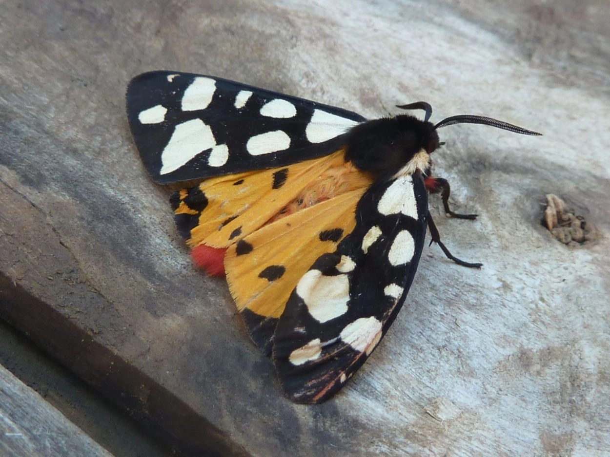 Voorvleugellengte: 25-32 mm. De voorvleugel van deze beervlinder is zwart met een variabel patroon van roomkleurige vlekken; de achtervleugel is geel. Het brede zwart behaarde borststuk heeft roomkleurige schoudervlekken. De kleur van het achterlijf verloopt van geel tot helder rood aan het uiteinde.