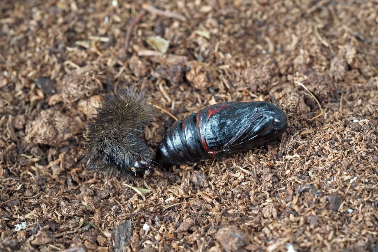 Tot 50 mm; lichaam zwart, bekleed met bruinachtige haarborstels, die op verheven wratten staan ingeplant; spiracula wit; poten purperachtig rood; kop roodachtig bruin.