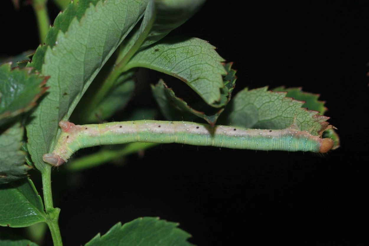 Tot 26 mm; de kleur varieert van geelachtig groen tot roze met over de rug een brede, donkergroene of purperachtig zwarte middenstreep; stippen wit, met uitzondering van een rij zwarte stippen onder de spiracula; de groene vormen zijn geelachtig tussen de segmenten; ronde kop roodachtig bruin, vaak met een grote zwarte vlek aan weerszijden.
