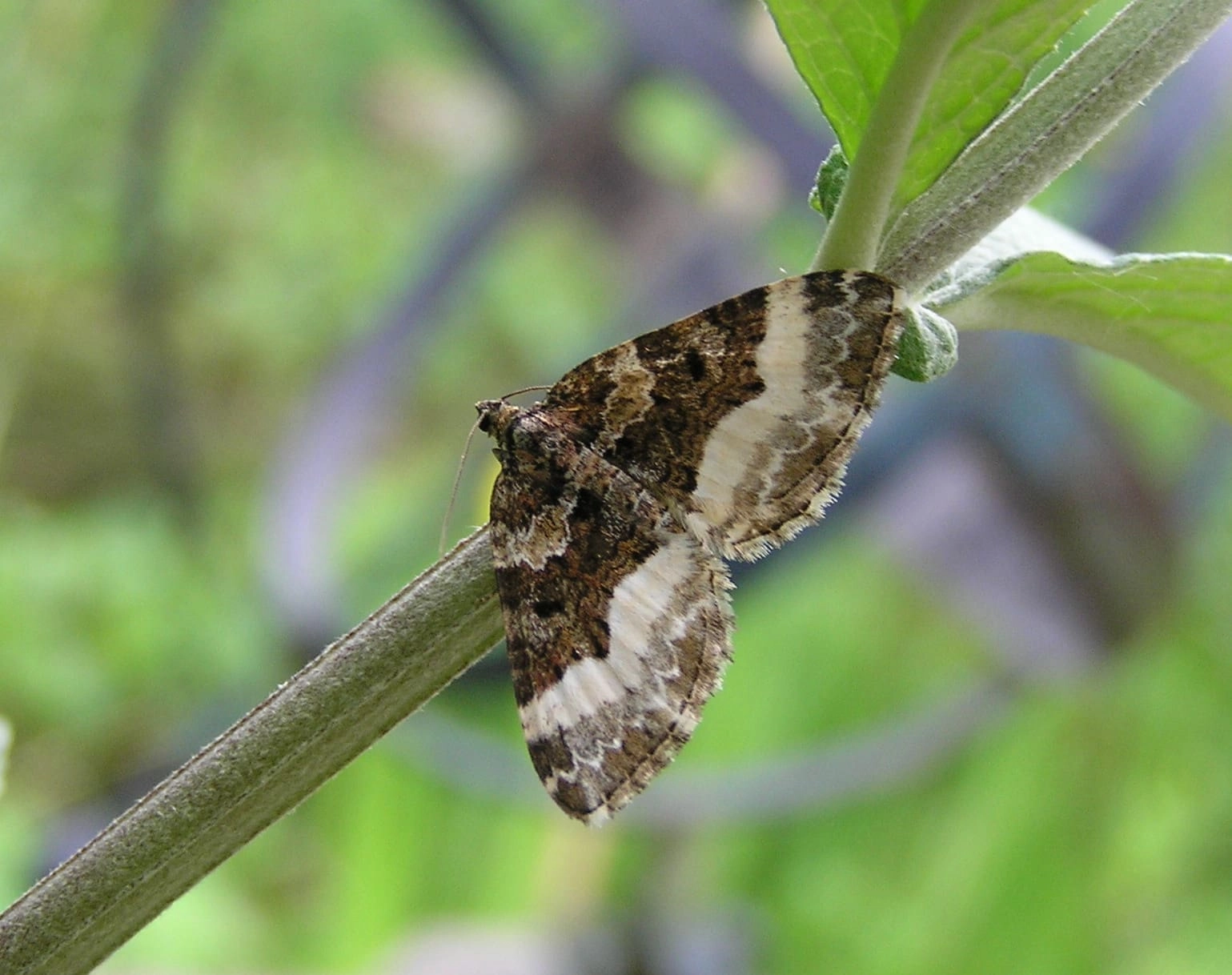 Voorvleugellengte: 13-15 mm. De buitenrand van de middenband vormt in het midden een scherpe punt. Deze punt steekt scherp af tegen de aangrenzende witte zone met daarin soms enkele flauwe grijze lijntjes. Meestal is de middenband tamelijk gelijkmatig donker gekleurd. De achtervleugel is grotendeels witachtig met een bruinachtig grijze achterrand.