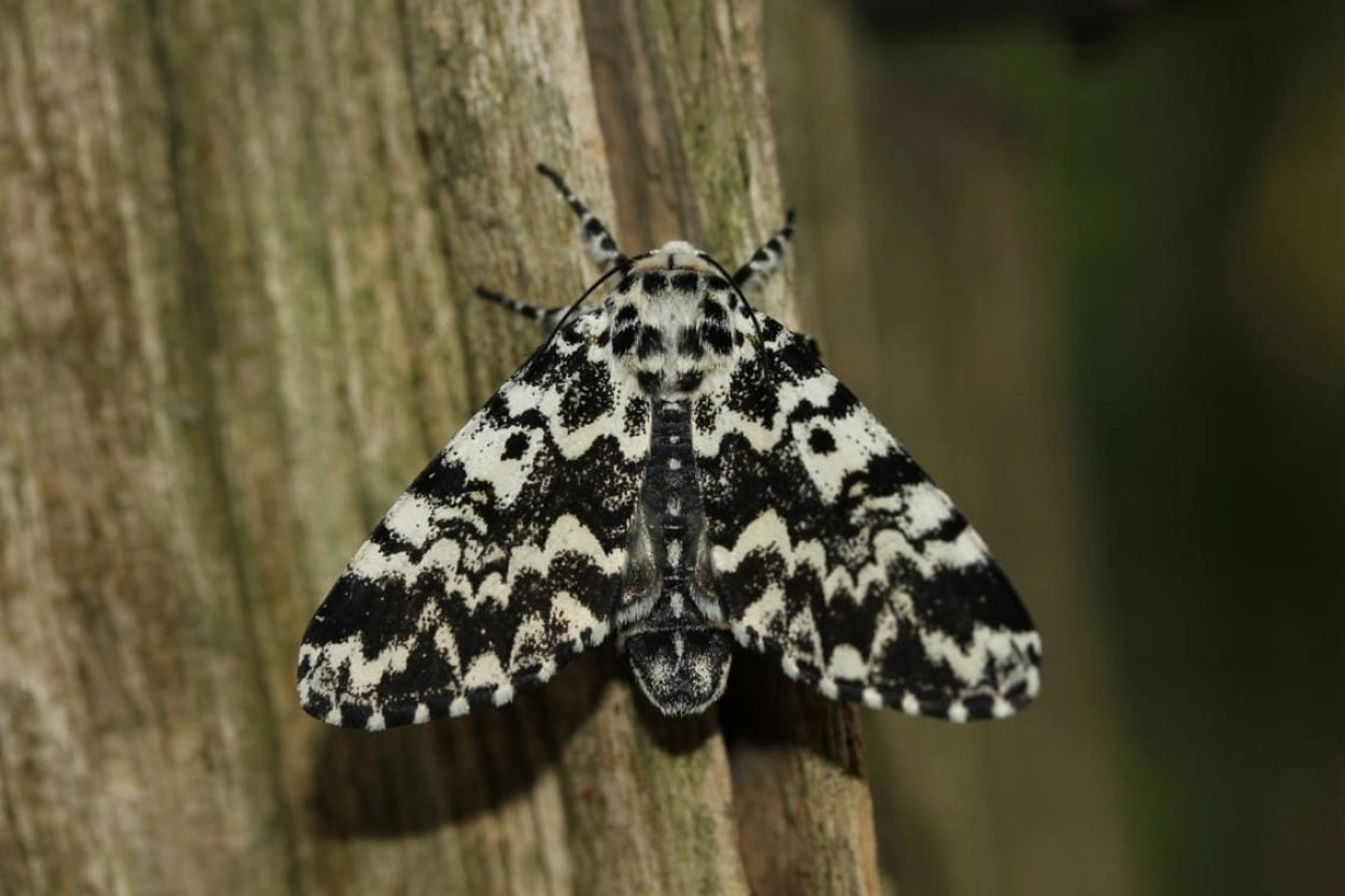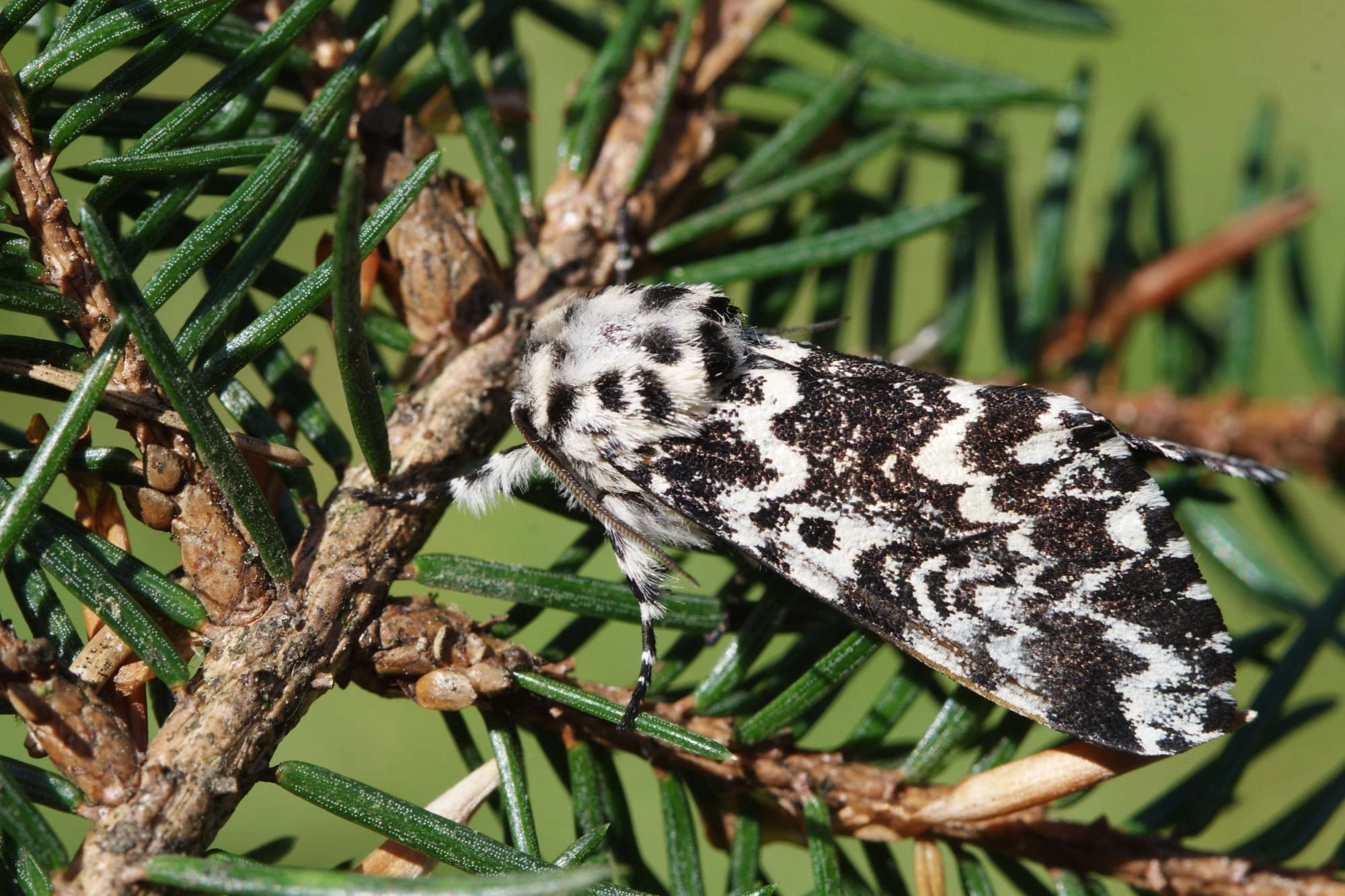 De nonvlinder (Lymantria monacha) is minder zwart getekend en heeft een ander vlekkenpatroon op het borststuk.