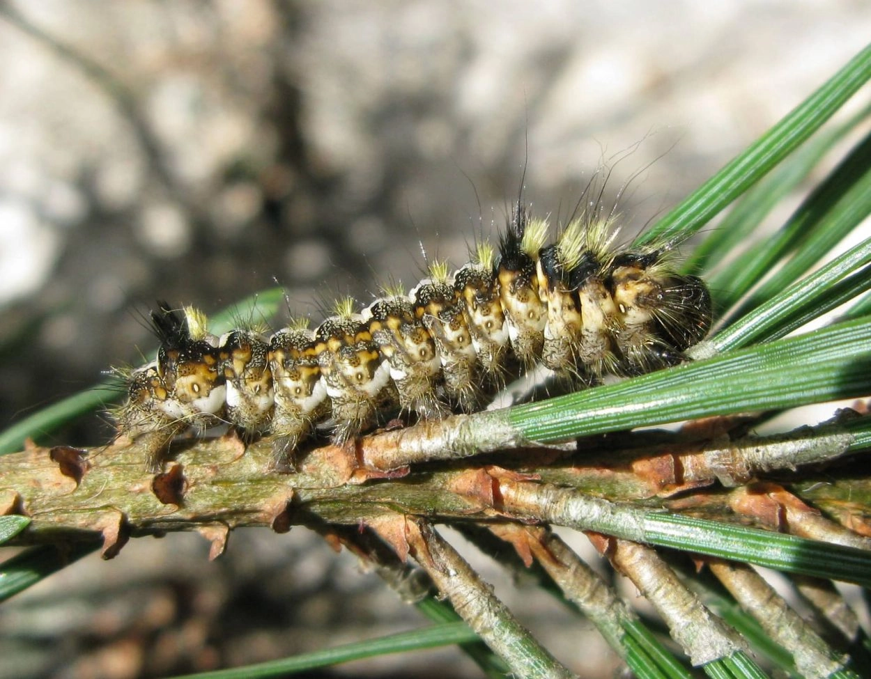Tot 60 mm; bekleed met witte en zwarte haarborstels, die op kleine geelachtig bruine wratten staan ingeplant; lichaam roodachtig bruin met rijen zwarte vlekken over rug en flanken; over het midden van de rug een rij witte vlekjes en een identieke rij onder de lijn van de spiracula; kop zwart.
