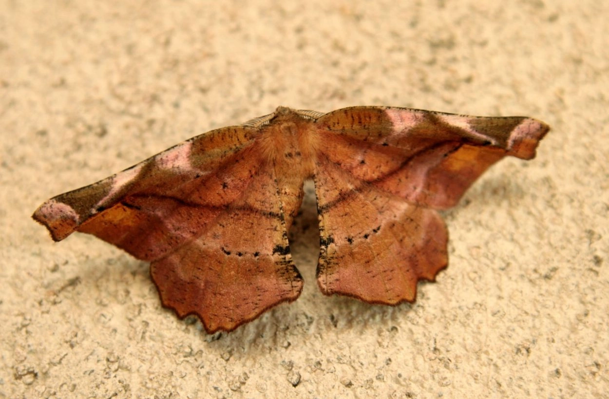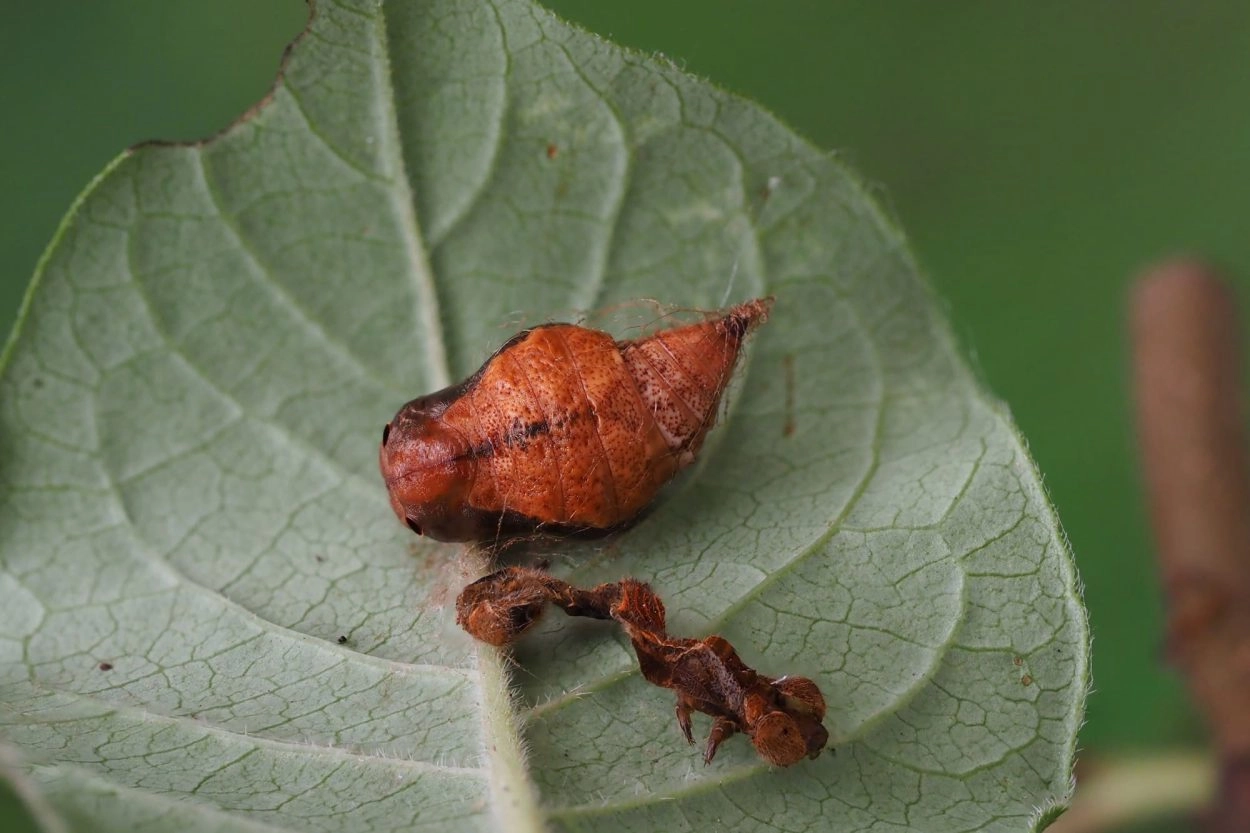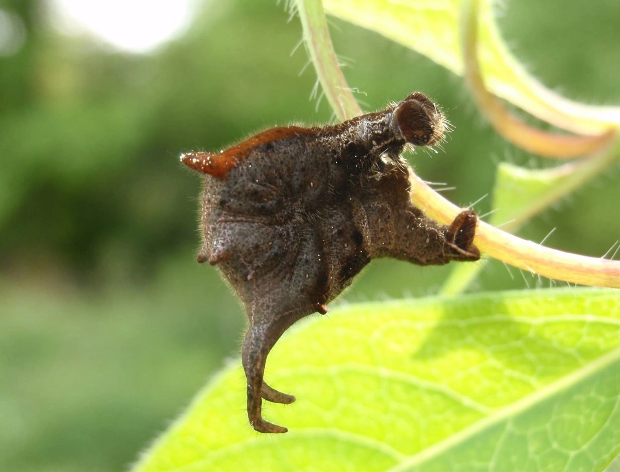 Tot 30 mm; lichaam dik, naar de kop en de staart sterk versmald, met een paar duidelijke, gekromde uitwassen op de rugzijde van segment acht en kleinere, dubbele bultjes op de segmenten zes en zeven; licht okerkleurig met donker olijfbruine of purperachtig bruine tekening; kop grijsachtig bruin.