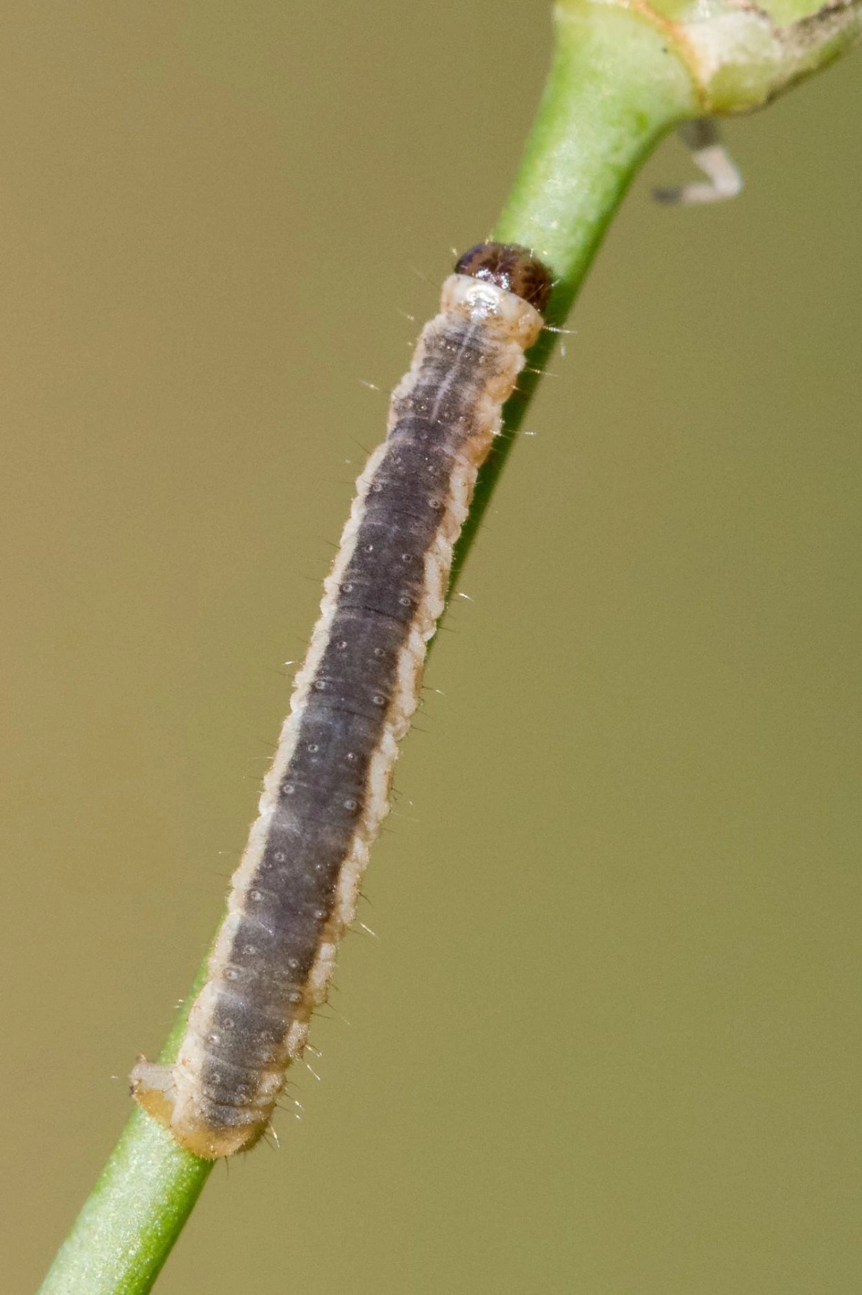 22-24 mm. Lijf okerkleurig met een donkerder grijsachtige ruglijn en soms met een zichtbare bruine subdorsale lijn; de kop is donkerbruin.