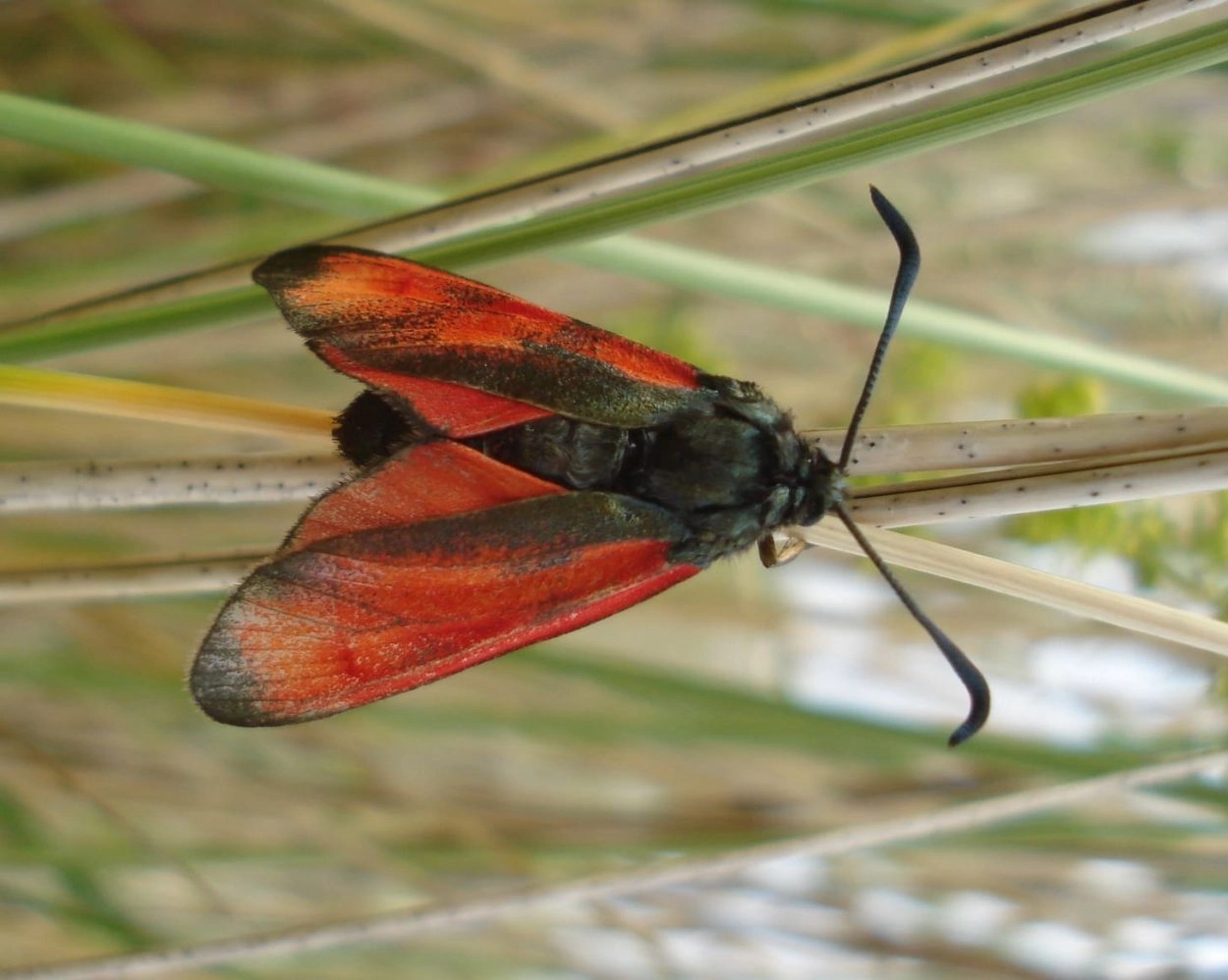 Vijfvlek-sint-jansvlinder (Zygaena trifolii).N.B.: vergelijk behalve de uiterlijke kenmerken ook de tijd van het jaar waarin de rupsen voorkomen, het habitat en de waardplant(en).