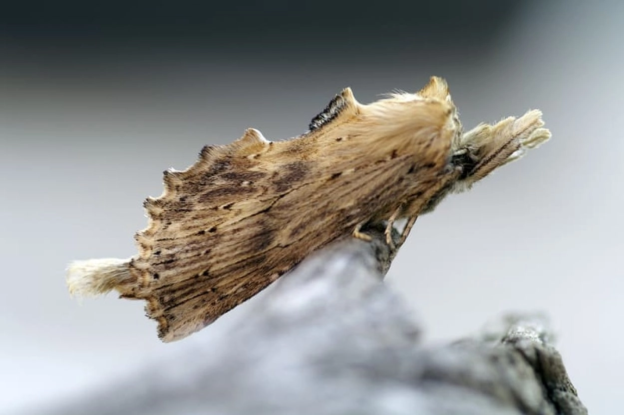 Berkentandvlinder (Odontosia carmelita).N.B.: vergelijk behalve de uiterlijke kenmerken ook de tijd van het jaar waarin de rupsen voorkomen, het habitat en de waardplant(en).