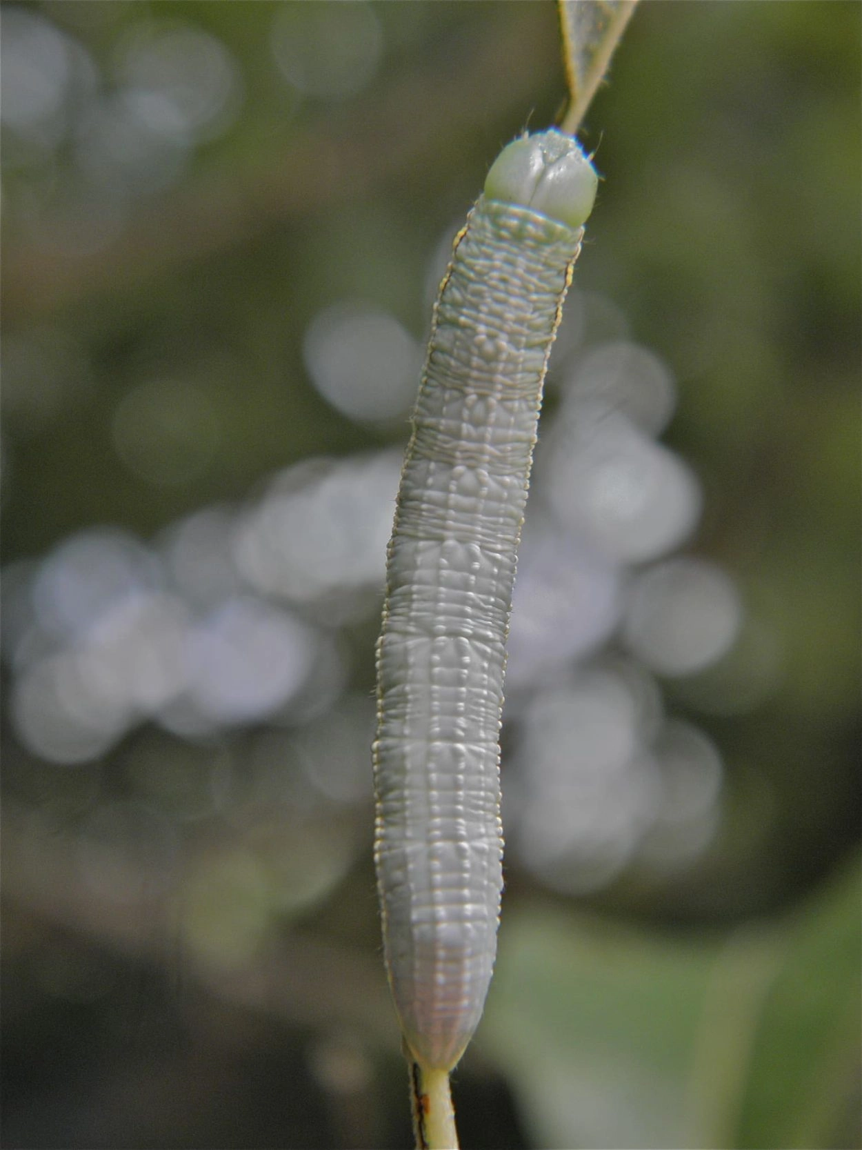 Tot 42 mm; lichaam met zeer veel dwarsplooitjes; kleur groenachtig blauw met een witachtige zweem boven de spiracula; over de rug vier witachtige lengtestrepen en boven de spiracula een witte lengtestreep, die langs de bovenrand een zwarte zoom heeft; kop blauwachtig groen met aan weerszijden een zwarte streep.