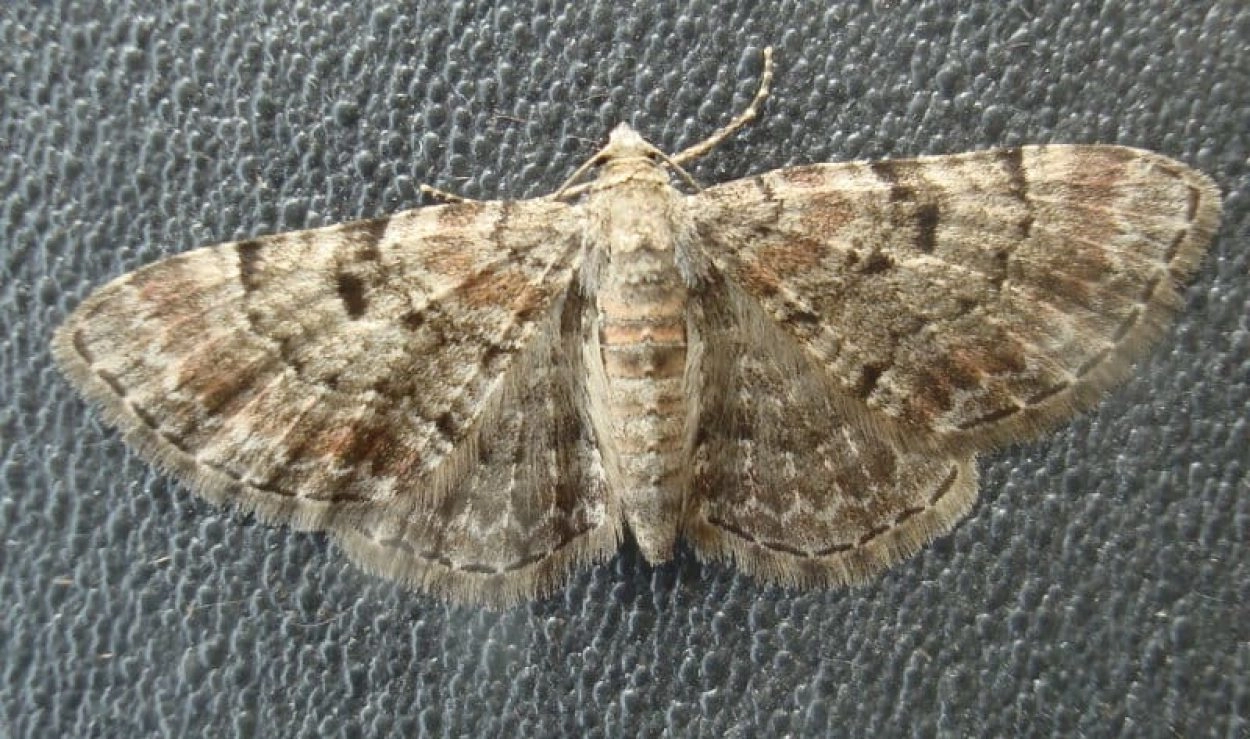 Voorvleugellengte: 11-15 mm. Een van de grootste van de Eupithecia-soorten die in Nederland voorkomen en daaraan meestal duidelijk te herkennen; soms komen echter kleinere exemplaren voor. De voorvleugel is vrij breed en heeft een duidelijke zwarte middenstip. De centrale dwarslijnen zijn zwart afgezet, vooral langs de voorrand, en vormen daar vaak twee zwarte vlekken; de vlek bij de binnenste dwarslijn vloeit vaak samen met de middenstip tot een grote, dikke zwarte balk. Zowel in het wortelveld als in het zoomveld bevindt zich een bruine dwarsband; het achterlijf heeft aan de basis eveneens een bruine band. Er is enige variatie in tekening.