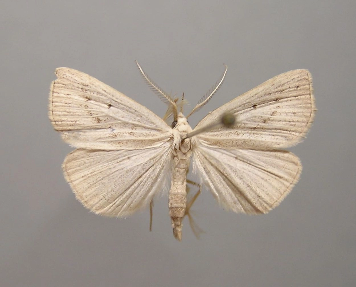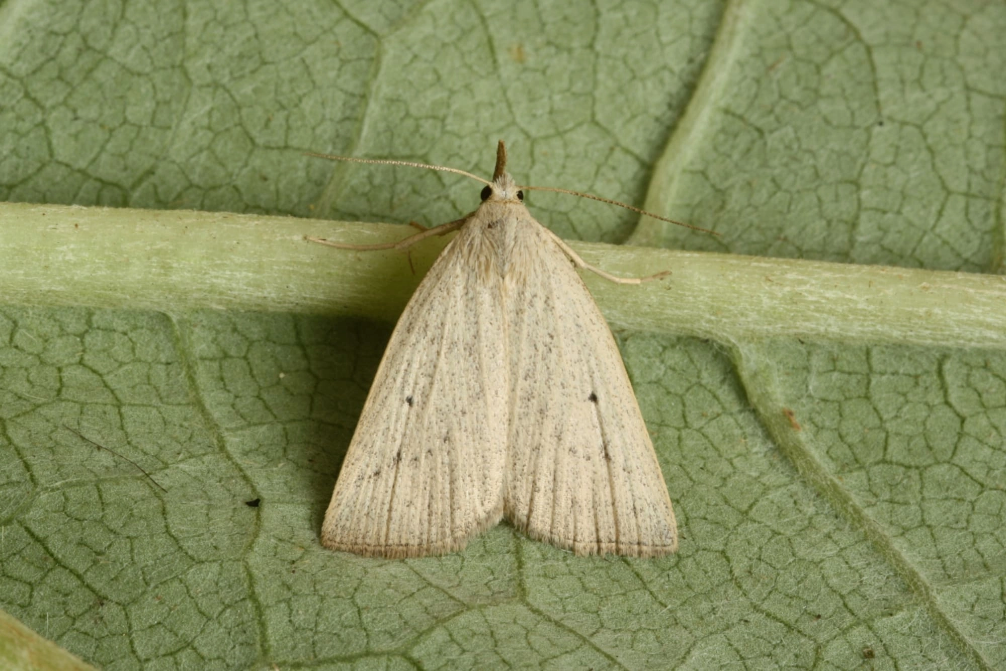 Voorvleugellengte: 13-14 mm. Deze snuituil is gemakkelijk van alle verwante soorten te onderscheiden door de witachtig en lichtbruin gekleurde voorvleugel, waarop twee rijen donkere stippen te zien zijn. Evenals de andere snuituilen heeft deze soort een opvallende 'snuit', gevormd door de lange palpen.