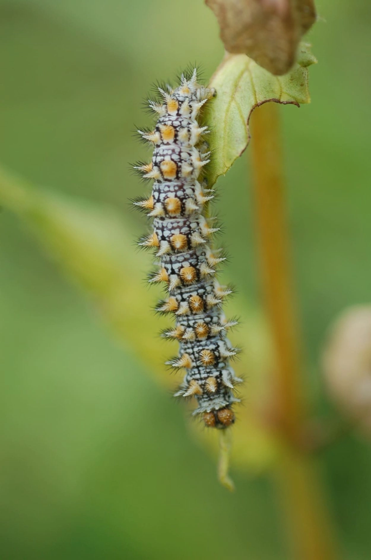 Tot 28 mm; lichaam witachtig met zwarte strepen en twee rijen grote, roodachtig oranje vlekken langs de rug, waarbij in elke vlek een doorn staat ingeplant; de overige doorns zijn witachtig met fijne zwarte haartjes; kop roodachtig bruin.