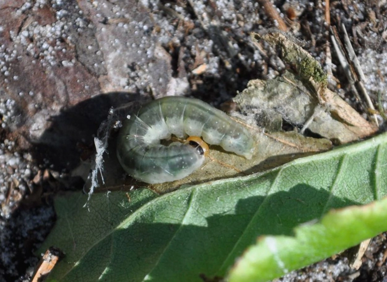 Tot 22 mm; lichaam groenachtig of grijsachtig wit met een brede donkergroene of grijsachtig groene middenband over de rug; nekschild op segment een glimmend zwart; onder de spiracula een rij donkergroene of zwartachtige vlekjes; kop geelachtig bruin.